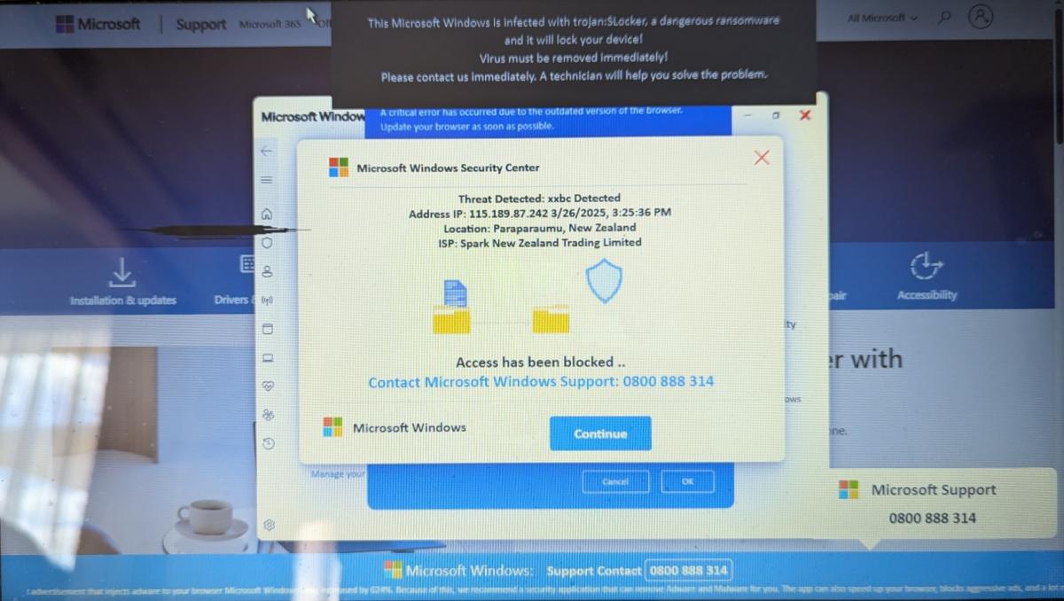 If you are online, especially on Facebook, and your screen gets taken over with information apparently from the Microsoft Windows Security Centre, saying your computer is infected and that you should call an 0800 number (see the attached picture) - DO NOT RING THAT NUMBER.