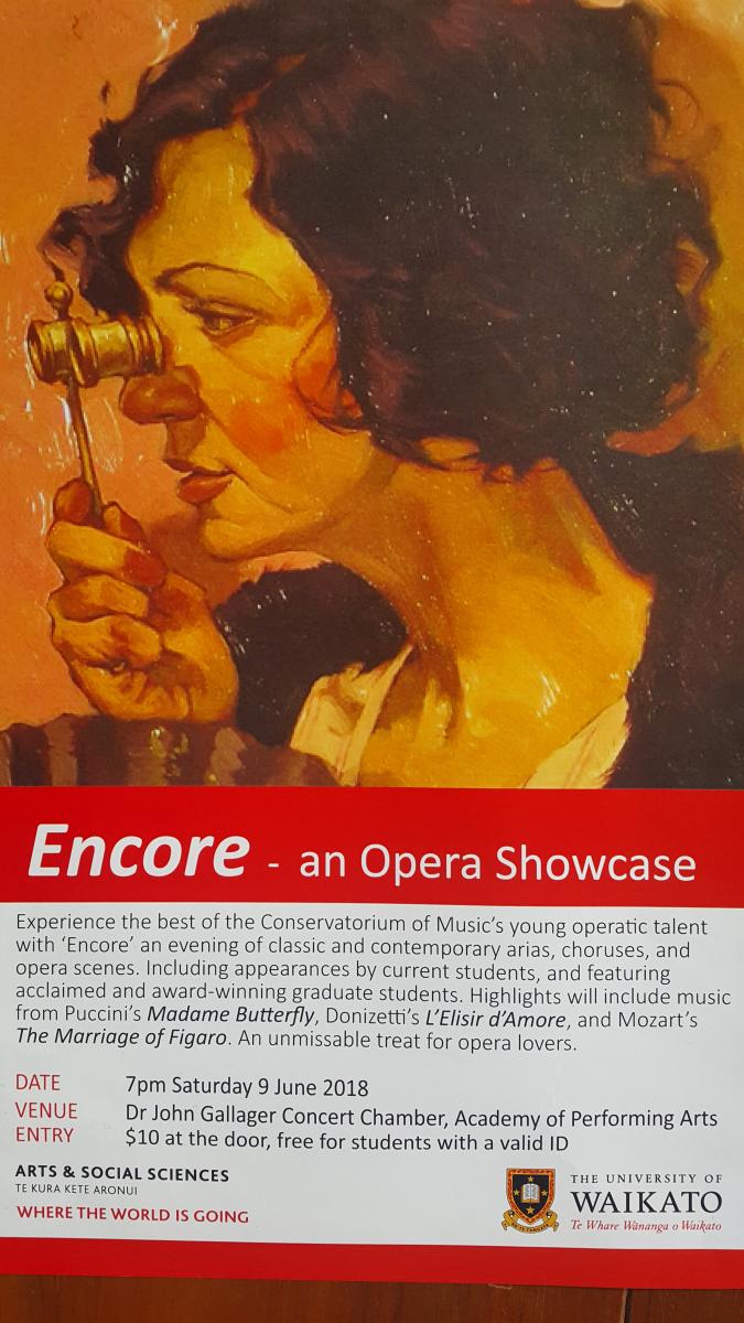 ENCORE - an Opera Showcase is sure to enlighten the senses. Come along to support the very talented local students of the Waikato (1st year to Masters students) who have been working very hard to bring this to the public. I can assure you a fantastic night out at the Opera for just $10 entry … View moreENCORE - an Opera Showcase is sure to enlighten the senses. Come along to support the very talented local students of the Waikato (1st year to Masters students) who have been working very hard to bring this to the public. I can assure you a fantastic night out at the Opera for just $10 entry (students free) - pay at the door, it's that simple!