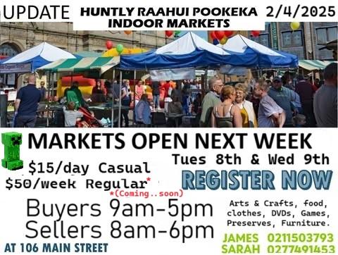 Just to inform you all of Huntly's Newest Indoor Markets, sellers from Tuesday 8th and Wednesday 9th Next week. few spots left but otherwise register your interest with us. Starts at 9 to 5pm for buyers