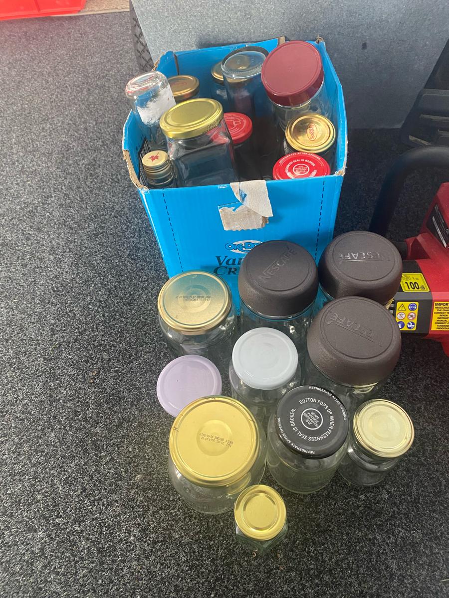 A box of sauce bottles and about a dozen jars, various sizes. Almost all with lids.