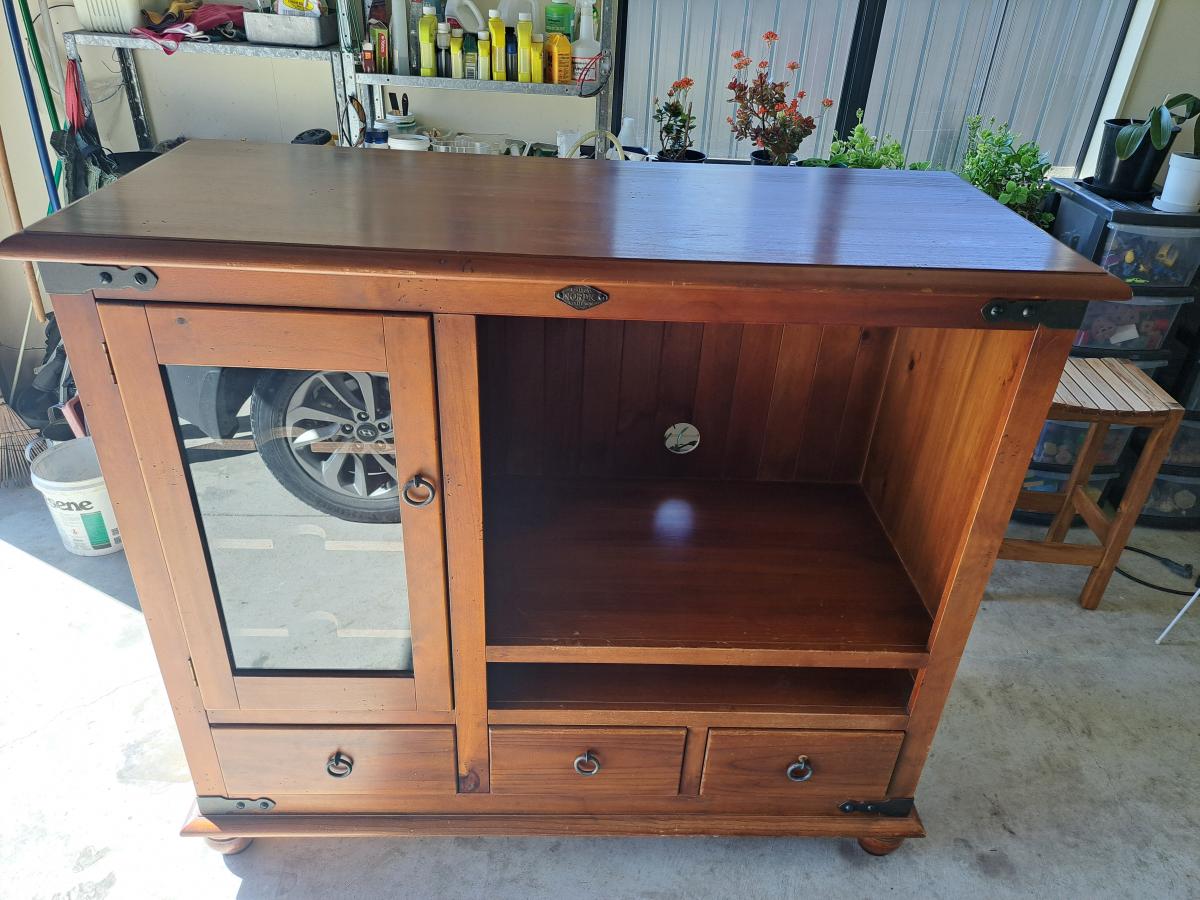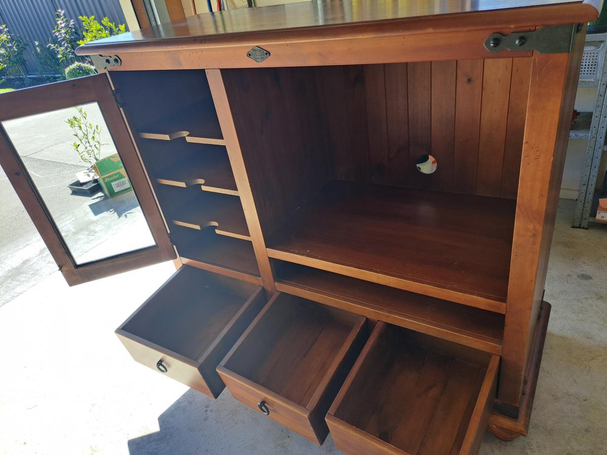 Description: There are 3 deep drawers on the bottom; 3 adjustable shelves in glass front side cabinet, a shelf under a large open space (630 wide and 800 high) where a television or stereo system could be put. If you are "handy" then it could also have shelves built to fit.