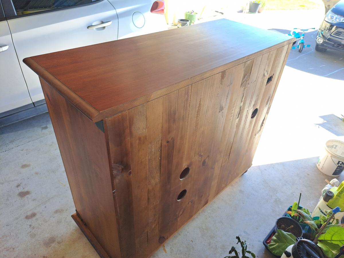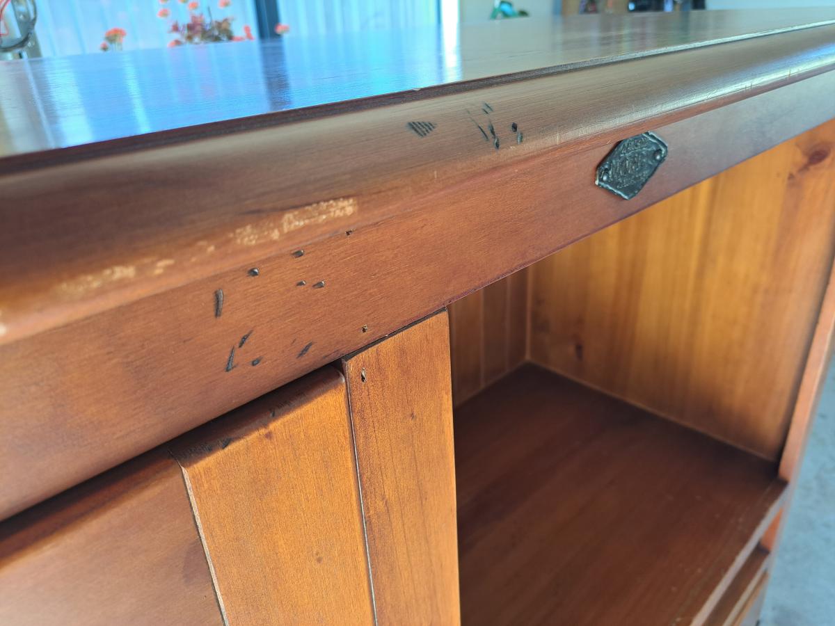 Its NZ made by Coastwood from solid pine timber with a distressed Sienna finish. it has a few scratches which are easily buffed out but overall in good condition.