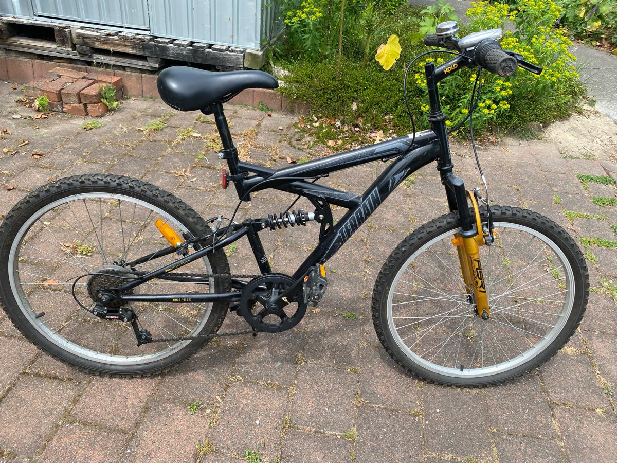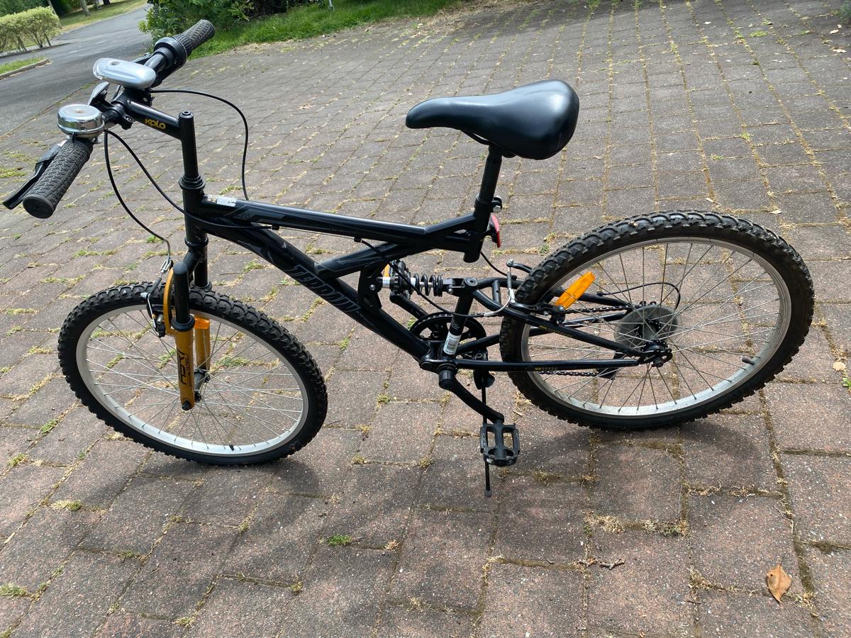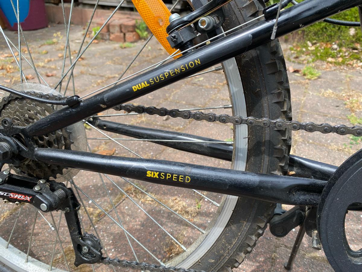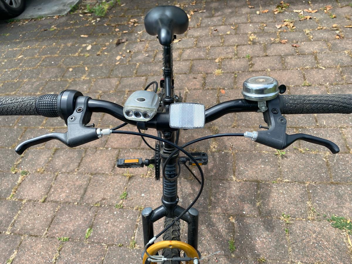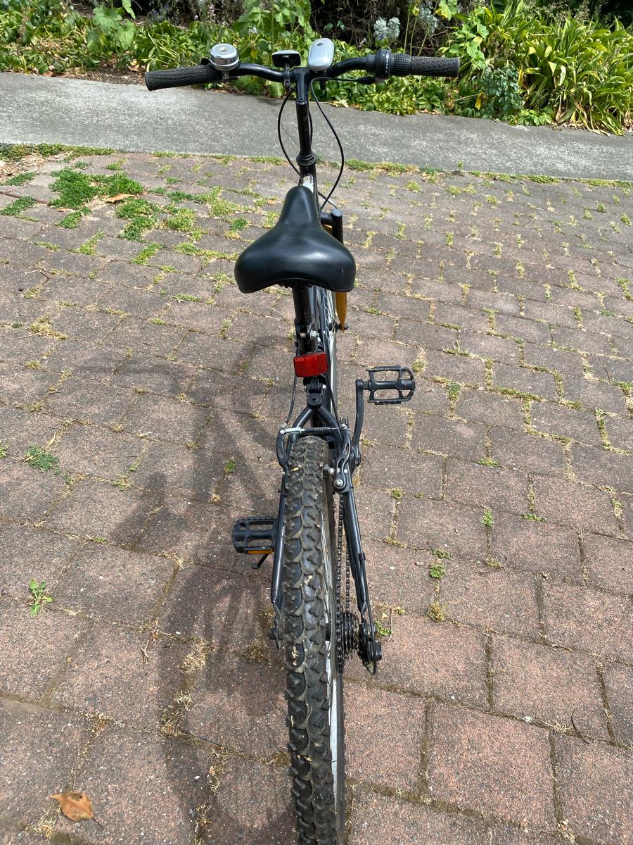 Comes with lightweight light, bell, hi-viz vest, basic key padlock and flame coloured visor helmet.
