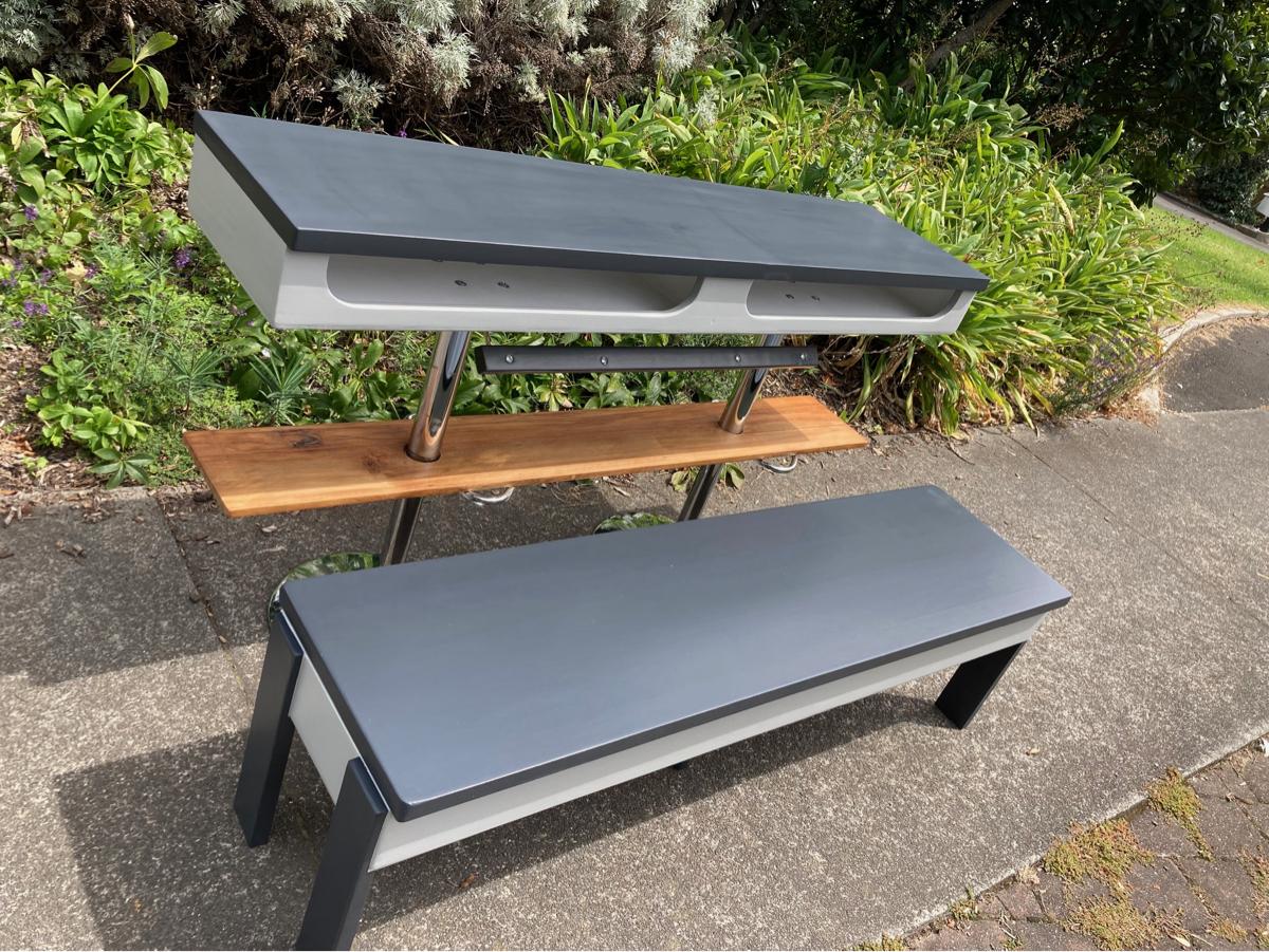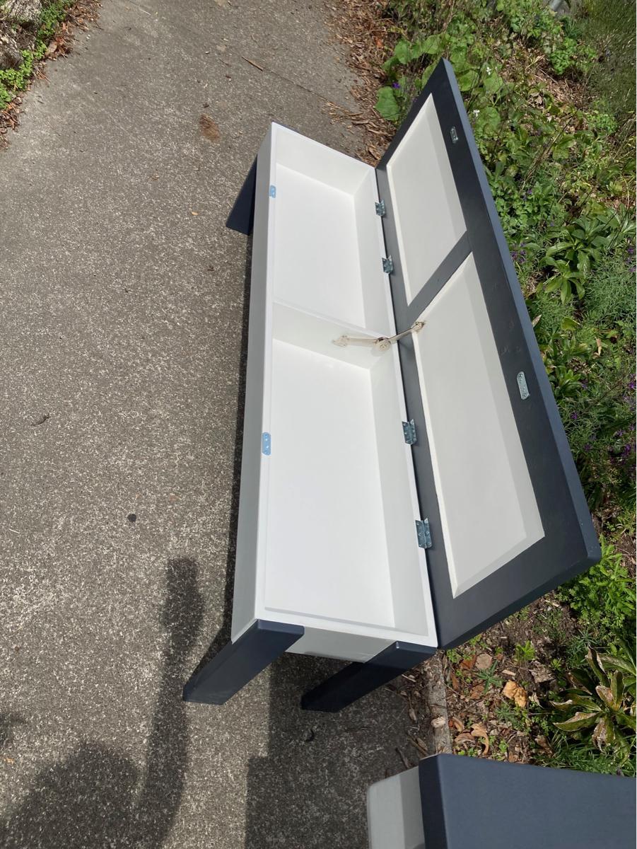 Height adjustable bench with inside storage and shelf, lowest height approximately 70cm to highest approximately 1m with the pull of the handle.