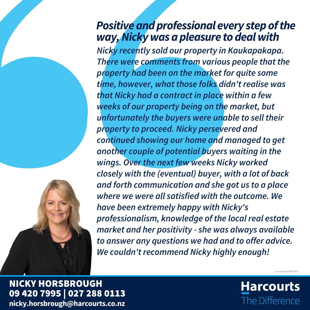 Nicky recently sold our property in Kaukapakapa. There were comments from various people that the property had been on the market for quite some time, however, what those folks didn't realise was that Nicky had a contract in place within a few weeks of our property being on the market, but unfortunately the buyers were unable to sell their property to proceed. Nicky persevered and continued showing our home and managed to get another couple of potential buyers waiting in the wings. Over the next few weeks Nicky worked closely with the (eventual) buyer, with a lot of back and forth communication and she got us to a place where we were all satisfied with the outcome. We have been extremely happy with Nicky's professionalism, knowledge of the local real estate market and her positivity - she was always available to answer any questions we had and to offer advice. We couldn't recommend Nicky highly enough!”