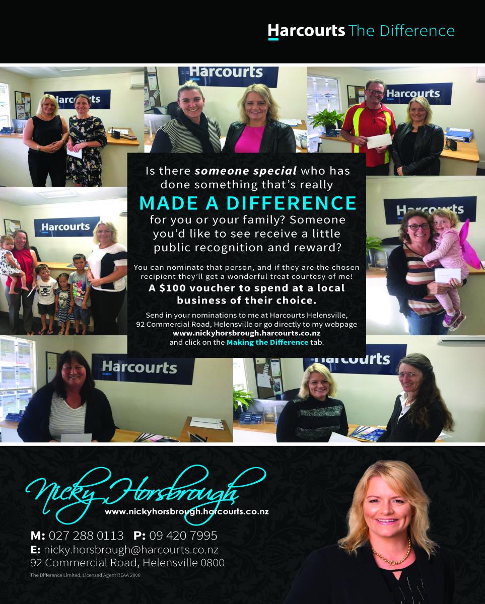 Send in your nominations to me - simply go to my web page nickyhorsbrough.harcourts.co.nz... and click on the 'Making the Difference' tab to fill out the form or write to me at 92 Commercial Road, Helensville.