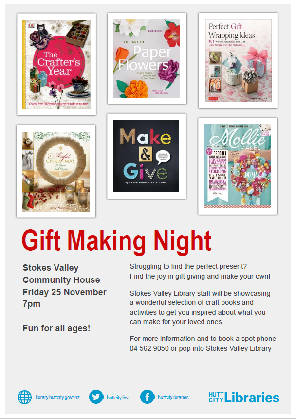 Stokes Valley Library staff will be showcasing a wonderful selection of craft books and activities to get you inspired about what you can make for your loved ones.