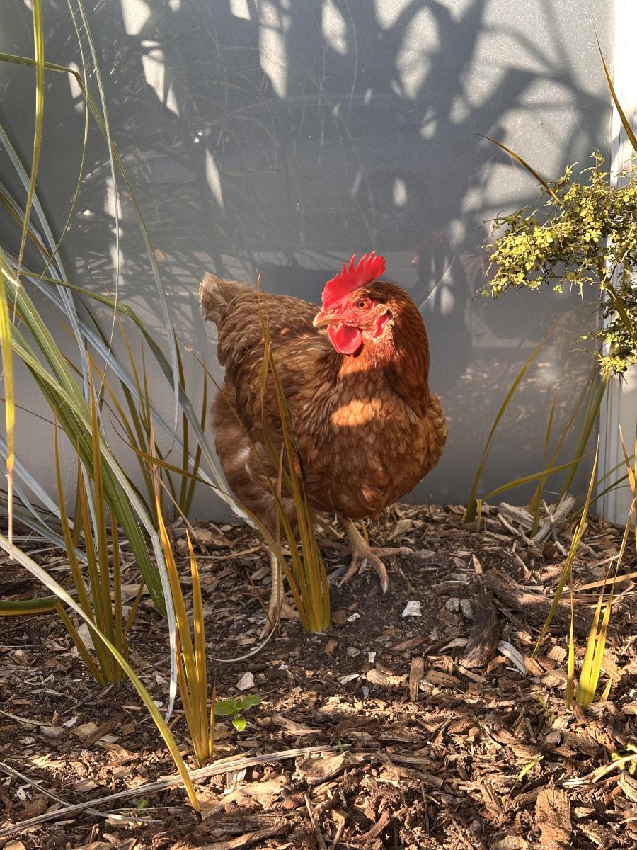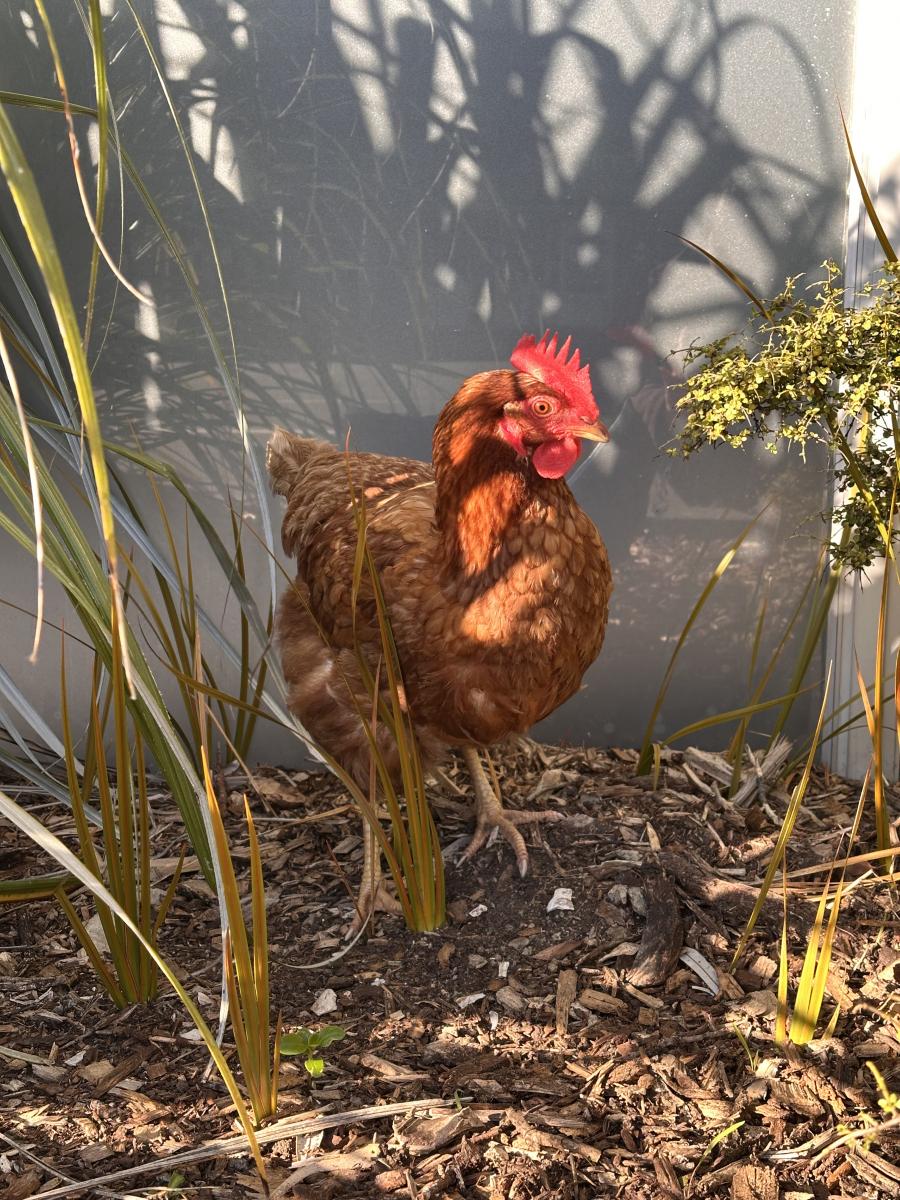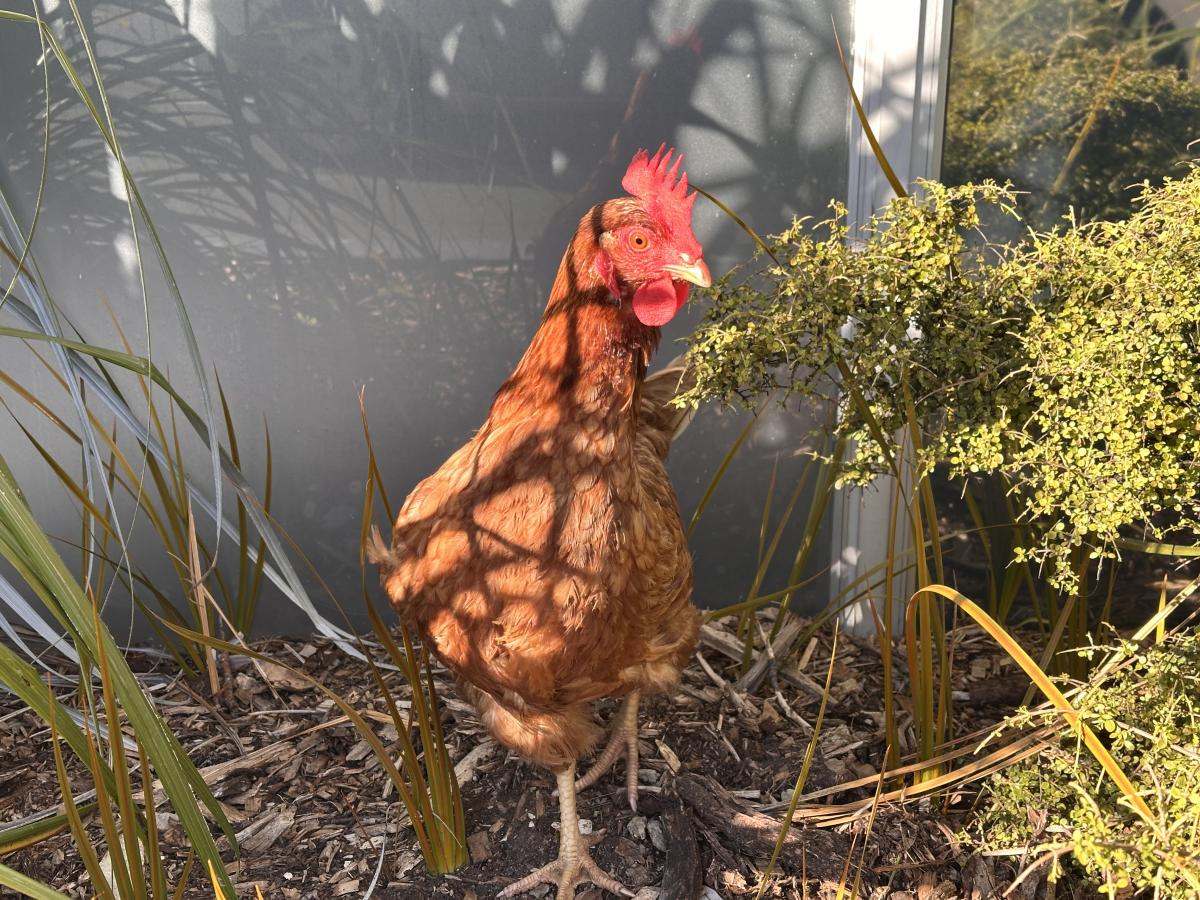 This friendly chicken was photographed outside the old library building near the bottom end of Broderick Road.