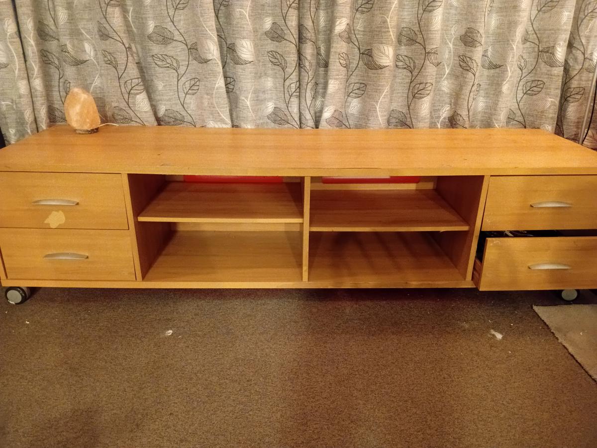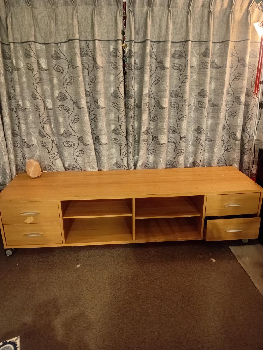 Nice solid unit with 4 small sliding drawers for storage and handy space at back for cables.couple of little marks nothing major