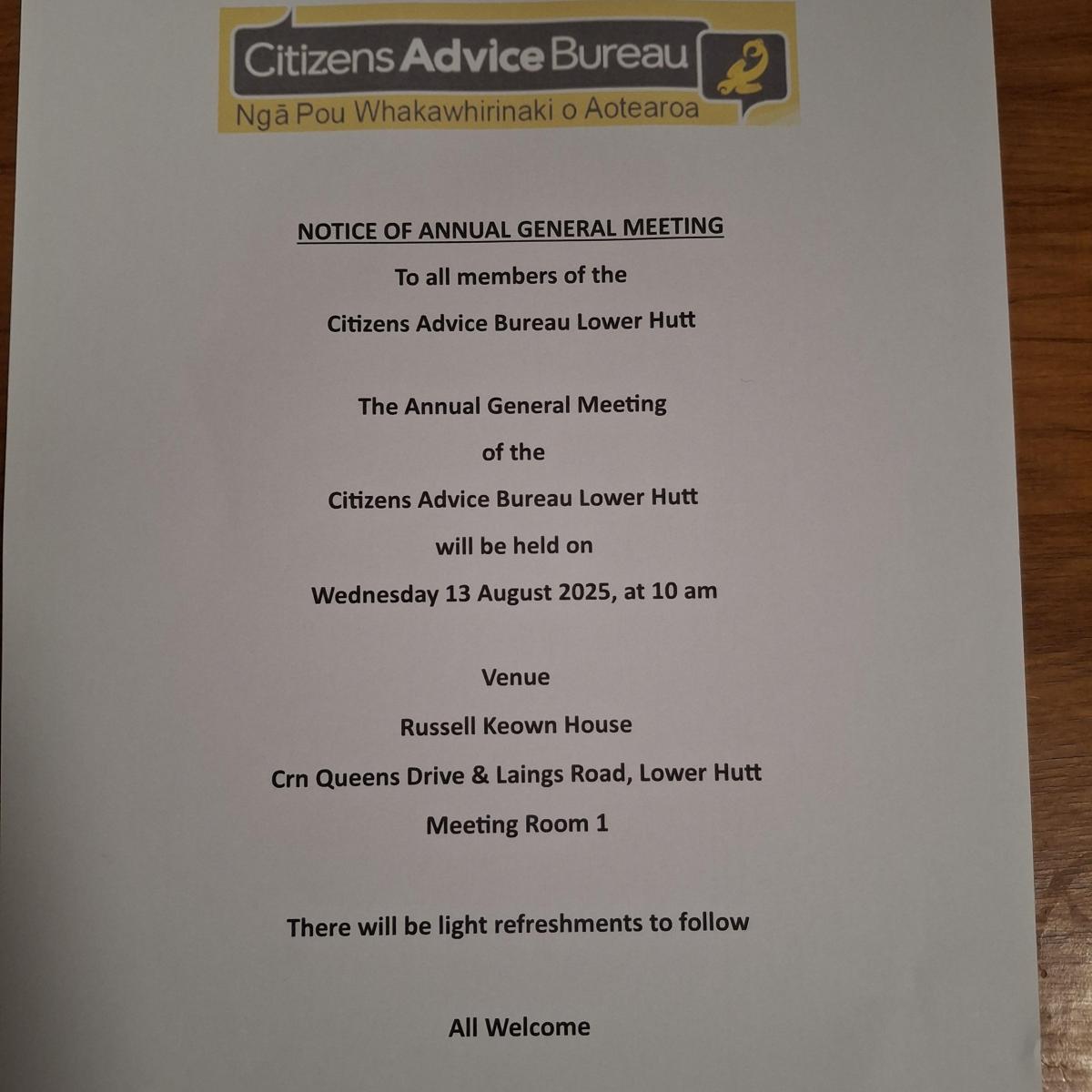 Lower Hutt Citizens Advice Bureau will be holding our AGM on Wednesday 13 August, 10.00am in Room 1, Russell Keown House. All welcome
