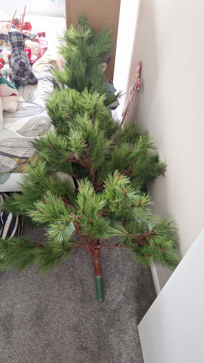 Looks great when decorated (decs don't come with sorry ). She sheds a few fake firs here and there (see pic) but if you dont mind that she's a good little tree. About 5ft tall. Comes with stand.
