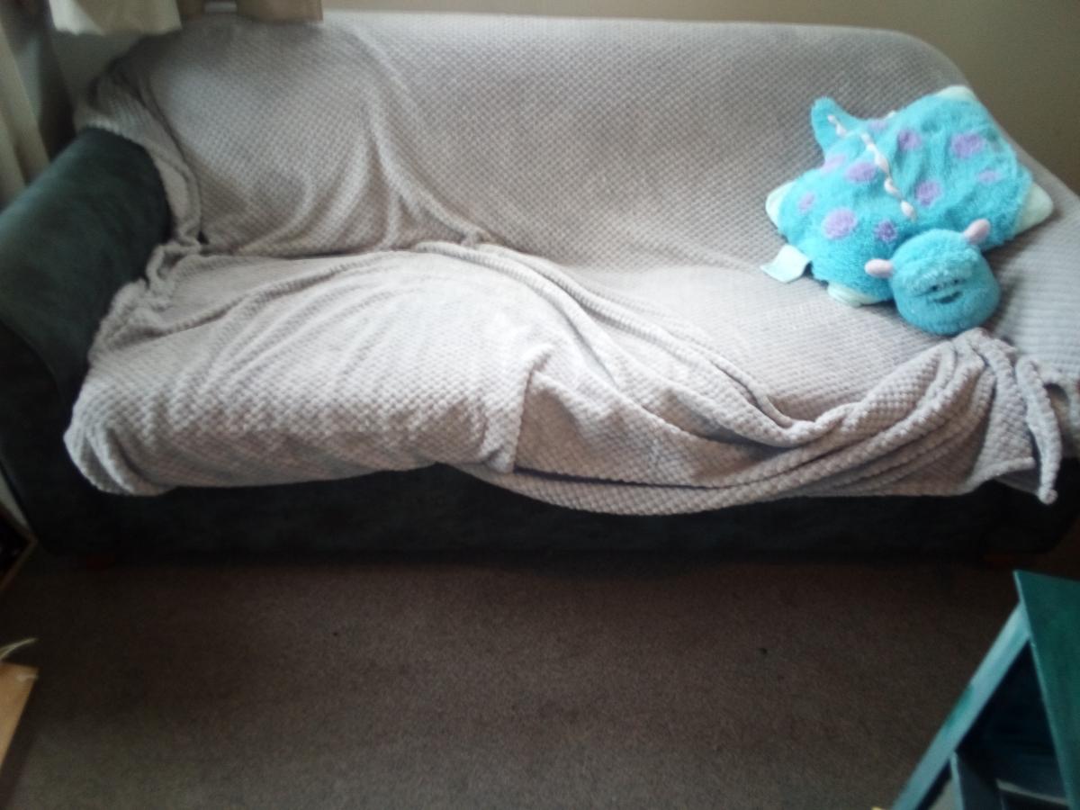 Great fold out comfy couch, used with a throw over it as the fabrics out dated. Has bed foam mattress also in it. No holds