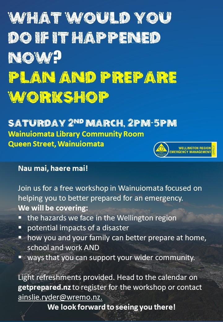 Come along to a Plan & Prepare Workshop to find out how you can be better prepared for an emergency. This workshop is hosted in the Community Room at the Wainuiomata Hub - there will be a movie showing for the kids in the library during the workshop as well! Saturday the 2nd of March, 2pm-5pm, … View moreCome along to a Plan & Prepare Workshop to find out how you can be better prepared for an emergency. This workshop is hosted in the Community Room at the Wainuiomata Hub - there will be a movie showing for the kids in the library during the workshop as well! Saturday the 2nd of March, 2pm-5pm, head to the link to register.