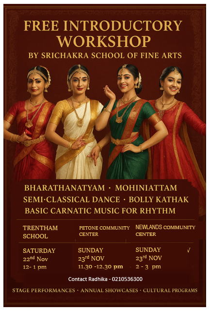 Lower Hutt - Petone … View moreAre you curious to know more about various Indian classical & semi-classical dance forms? If yes, then Srichakra School of Fine Arts is conducting 3 free introductory workshops. Register here: forms.gle...