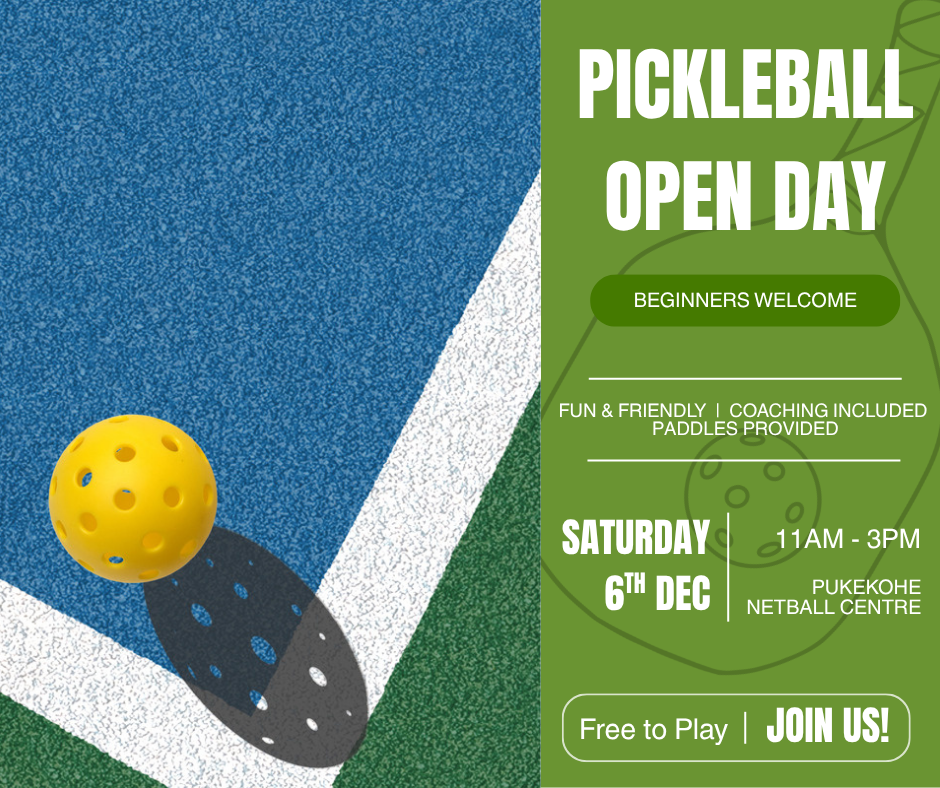 Entry is free and we have paddles and balls available and one of our super friendly club members will show … View moreThe Pukekohe Pickleball Club is holding an open day to celebrate the opening of their new venue at the Pukekohe Netball Centre in Queen St Pukekohe on Saturday 6 December from 11am to 3pm