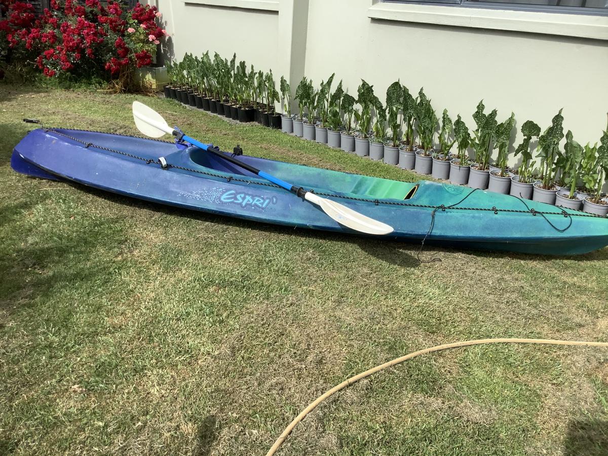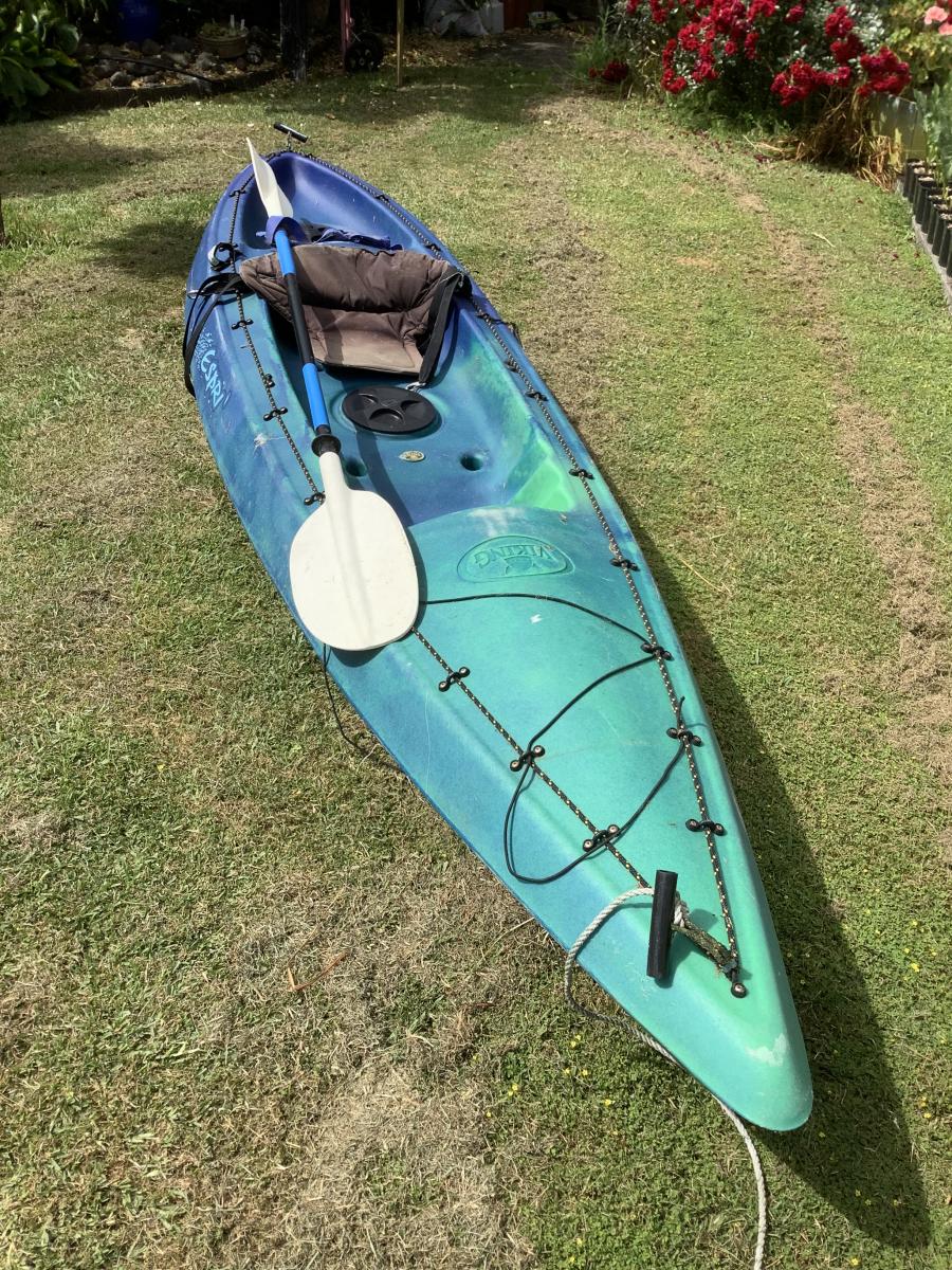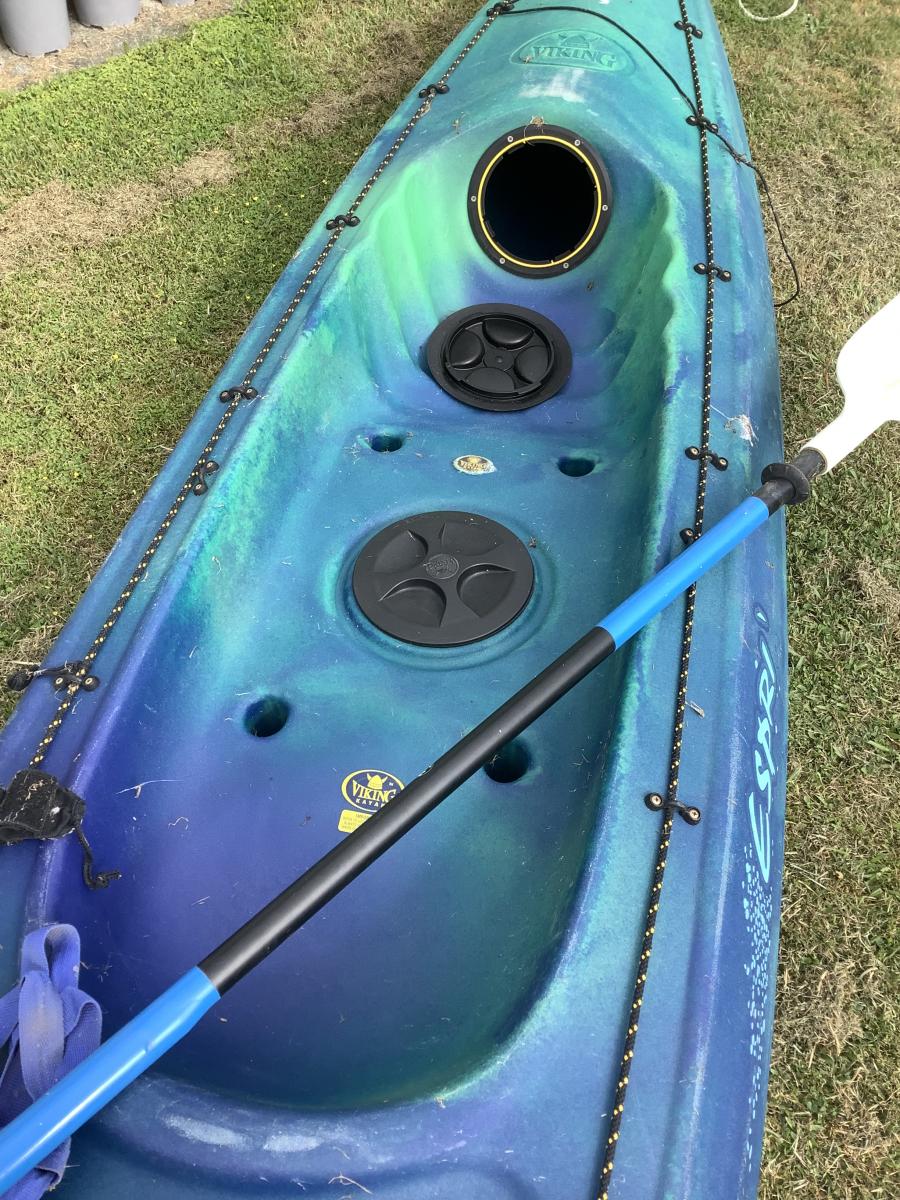 Viking Espiri Kayak for sale. 3.6m long. Rear and mid dry hatches (3).Suitable 1adult and 1child. Paddle, backrest and Includes 3 buoyancy aids ( 2 med adult and 1 med child).