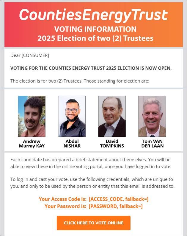 You'll find your unique code and password in your voting pack. If you receive your power bill via email, your voting pack will come the same way. Don't forget to check your spam folder!