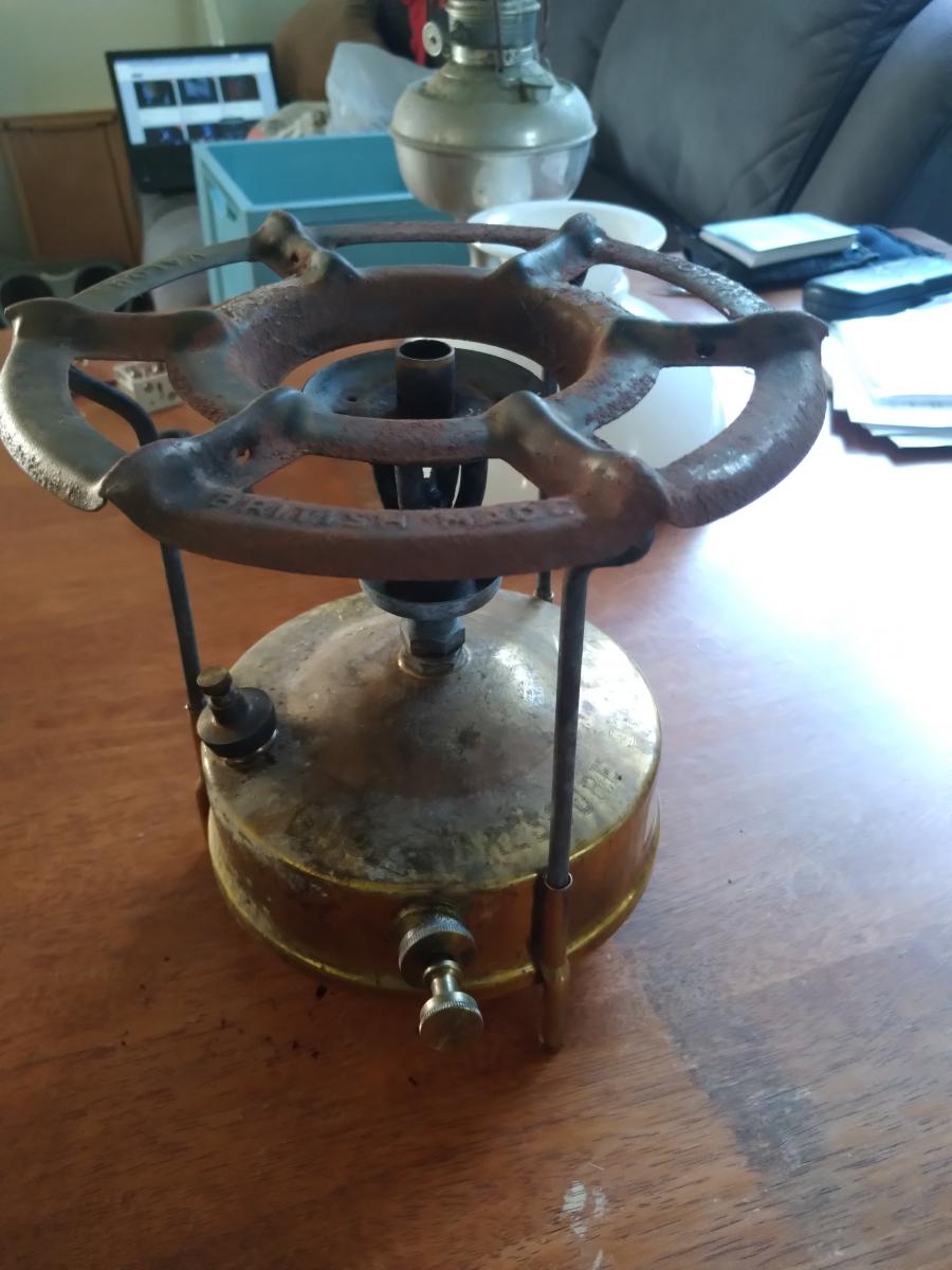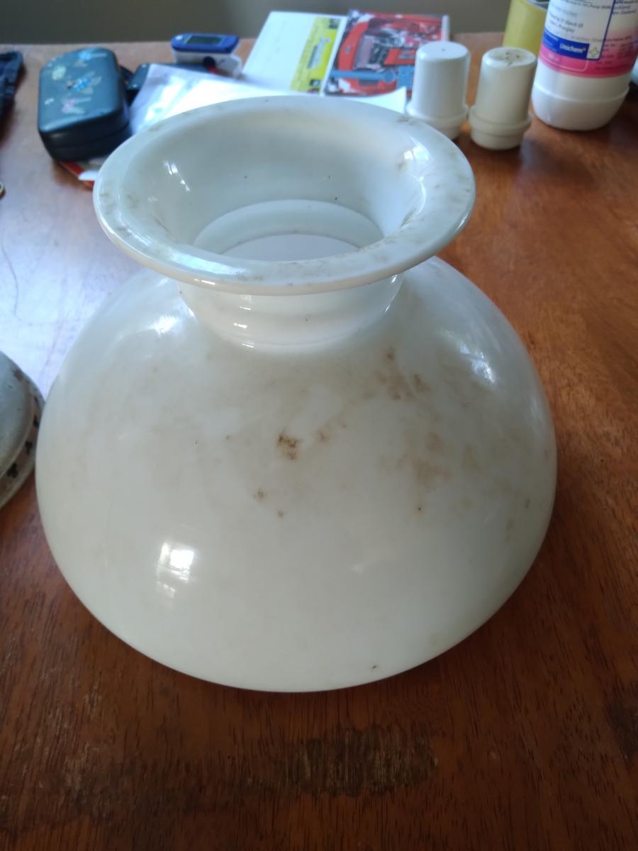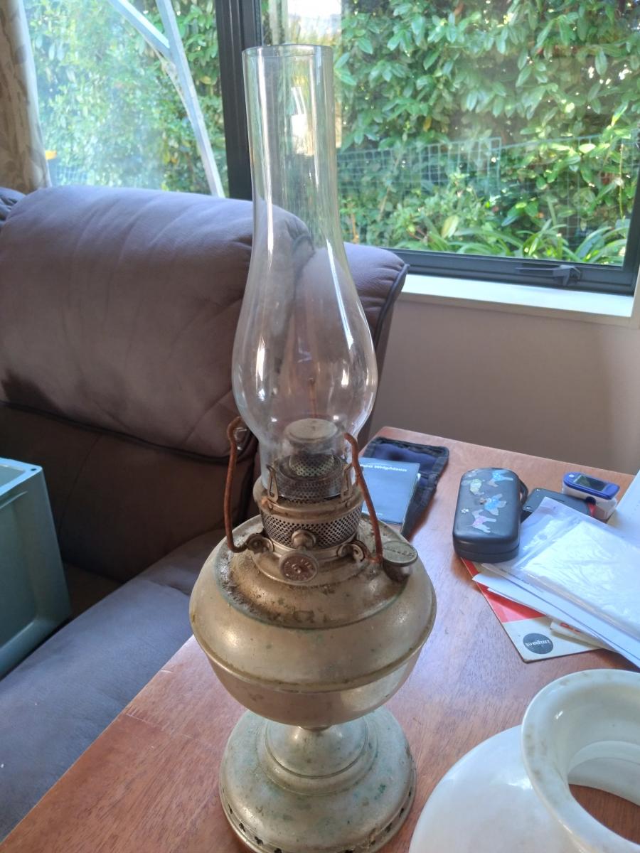 old kerosene? Lamp and cooker, white shade has a fine Crack through it.
