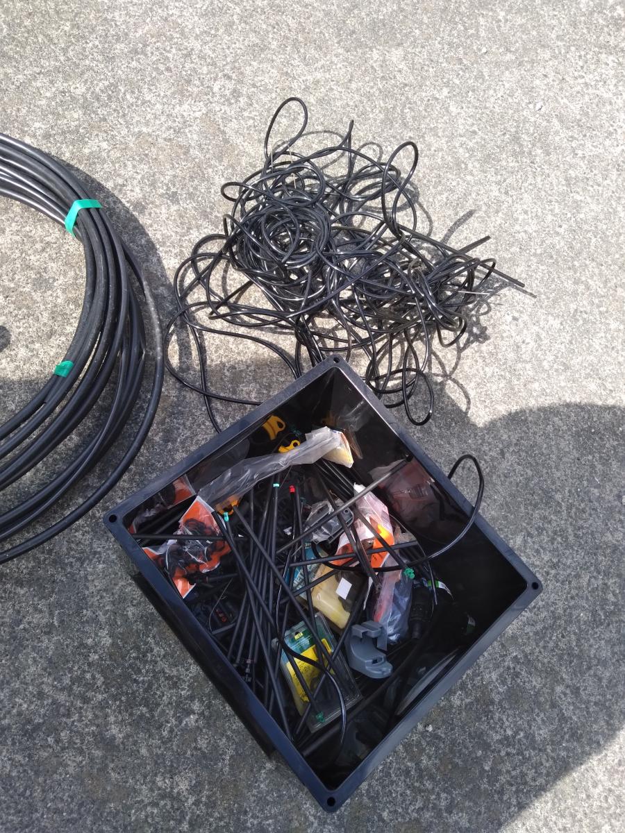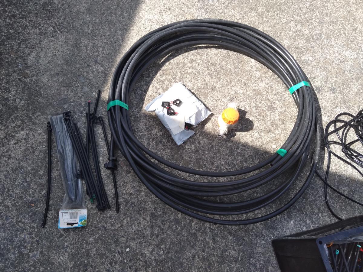 Irrigation tubing, uprisers, timer and spray heads (approx 100) (box not included)