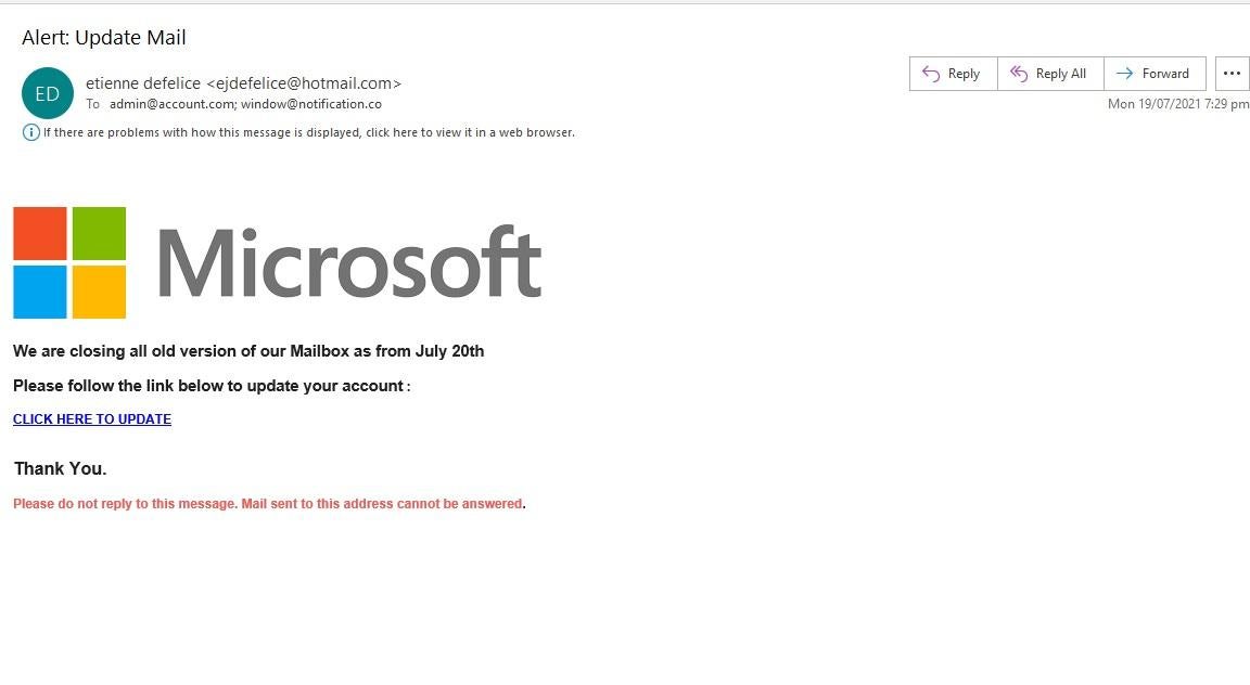 If you were to click on "CLICK HERE TO UPDATE" you would be taken to a scam site that would look just like a real Microsoft site & you would be asked to enter your details - The scammer would then have your login credentials & access to your email account.