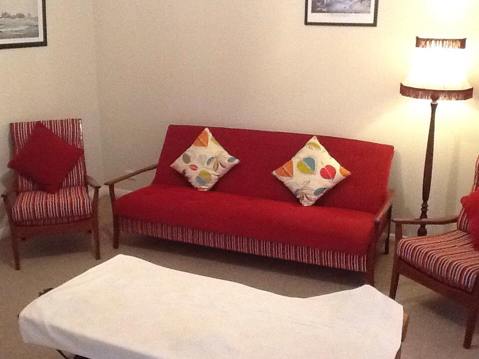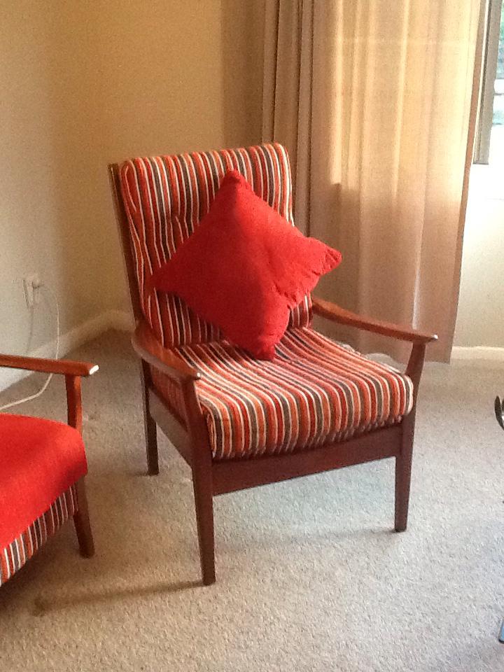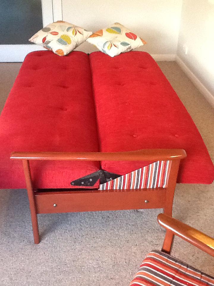 Red three seater sofa bed plus two red grey orange and white striped chairs,needing a new home Allso on other sites
