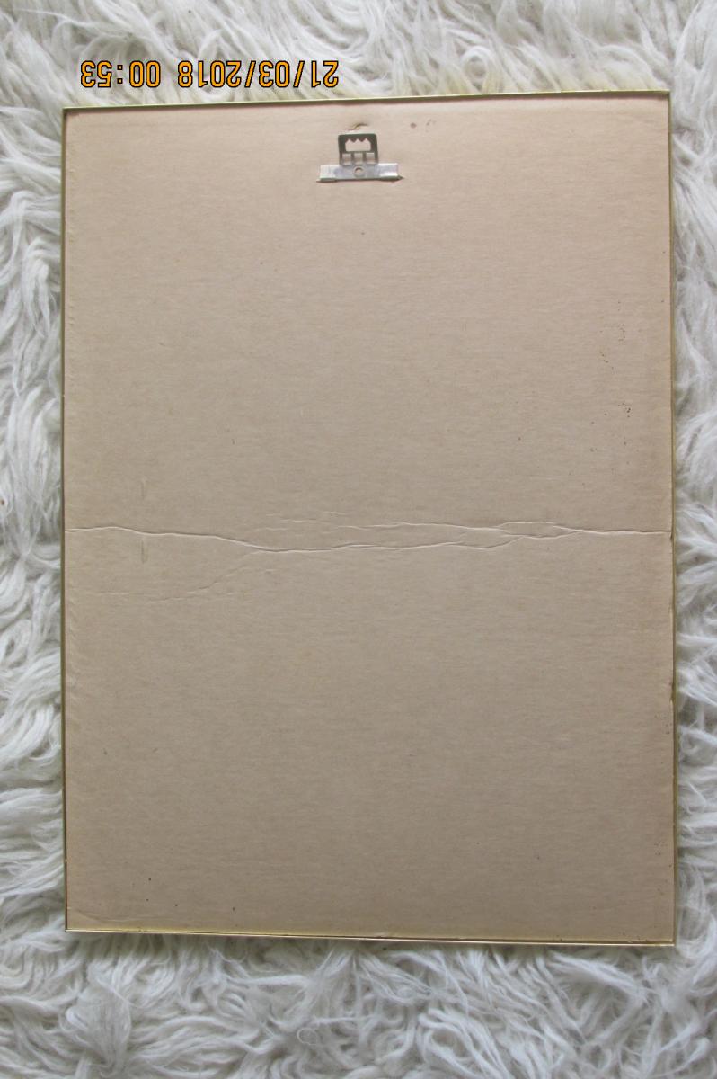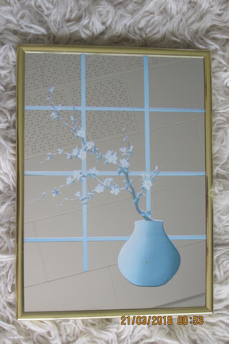 Mirror measures 28 by 38.5cms.. Latiice window with blossom motive on it. Gold frame.