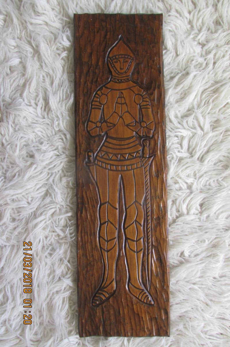 It depicts a Medieval knight. The subject is etched into the wood using chisel work and the background is adzed.