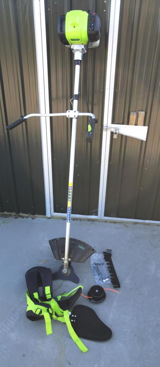 Just over a year old. Has only been used with the blade. Includes harness. Easy to start and does the job. Having to sell due to my 70+ year old shoulders no longer being able to cope with heavy gardening activities.