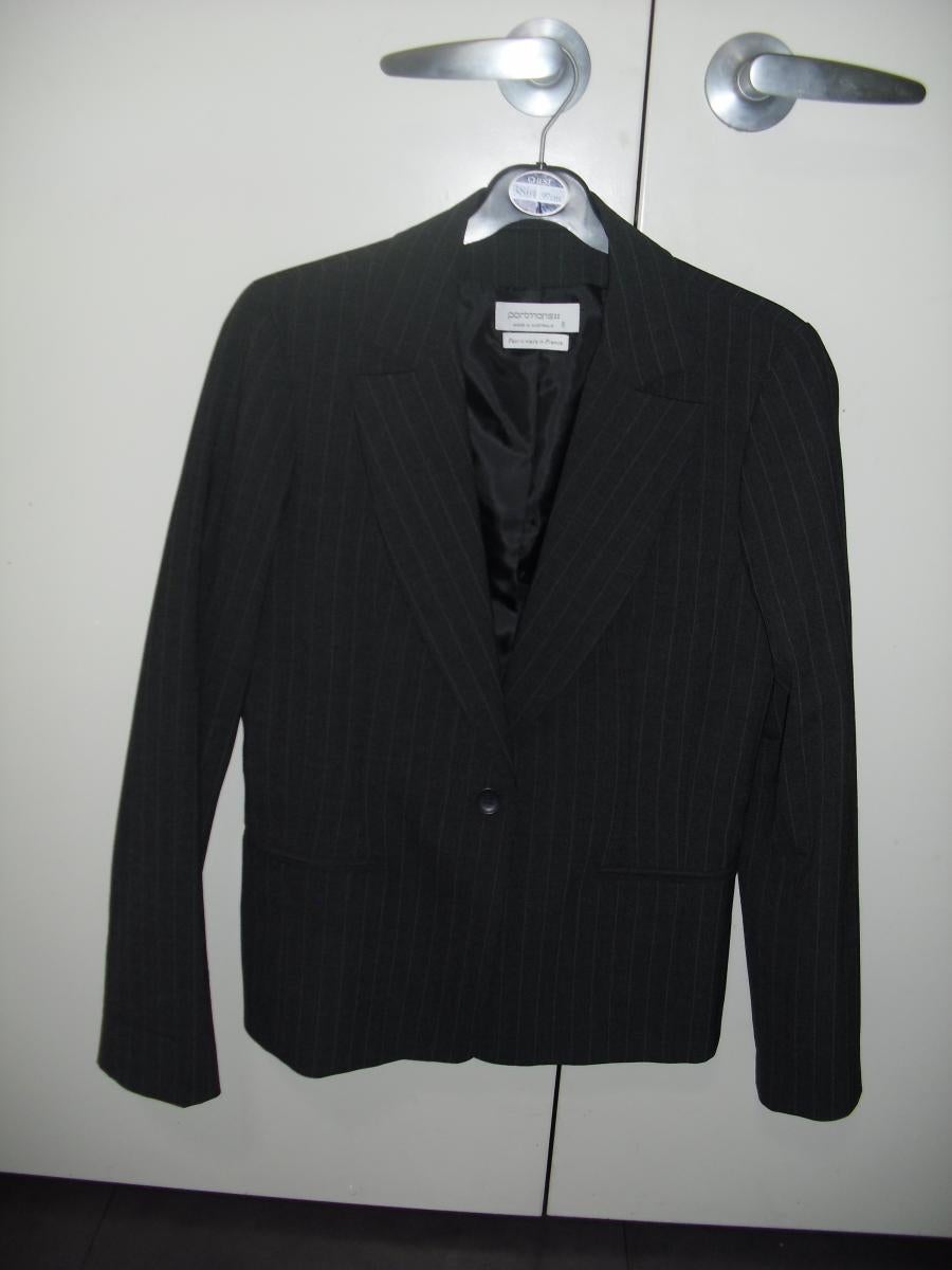 Size 8 Portmans dark grey pin striped blazer style jacket in excellent condition. Made in Australia of fabric made in France. Worn a couple of times and now not needed. Ideal for work or just as a smart leisure jacket.