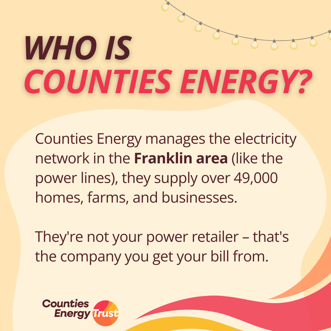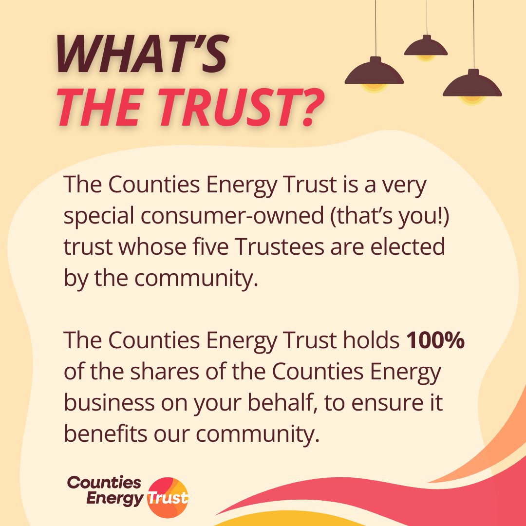 The Counties Energy Trust holds 100% of the shares of the Counties Energy business on your behalf, to ensure it benefits our community. Why vote? This is your community and your stake in the local energy infrastructure. Don't forget, The Counties Energy Trust is a consumer owned trust, so have… View moreThe Counties Energy Trust holds 100% of the shares of the Counties Energy business on your behalf, to ensure it benefits our community. Why vote? This is your community and your stake in the local energy infrastructure. Don't forget, The Counties Energy Trust is a consumer owned trust, so have your say today! Did you know the annual discount you receive on your electricity bill around December can only be achieved with 100% trust ownership! Vote with confidence, learn about the candidates and vote online for the one who best represents your energy needs.