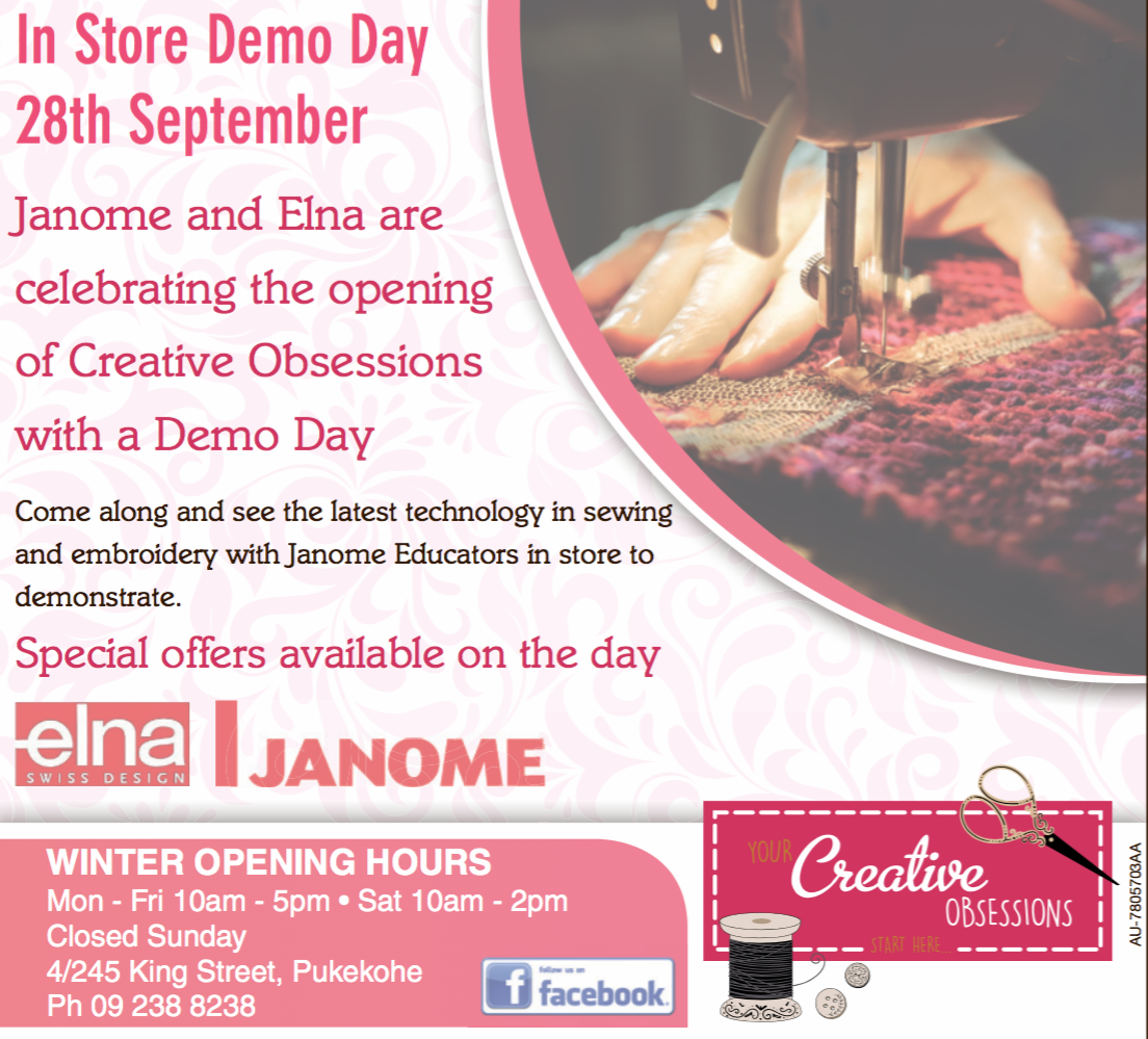 Save the date! Paula from Janome/Elna will be in the shop all day on Thursday 28th Sept, From 10am until 5pm. She will be doing demonstrations on the machines, and will be available to answer all your queries. We will have a gift for the first 20 customers, and 4 lucky dips to give away throughout … View moreSave the date! Paula from Janome/Elna will be in the shop all day on Thursday 28th Sept, From 10am until 5pm. She will be doing demonstrations on the machines, and will be available to answer all your queries. We will have a gift for the first 20 customers, and 4 lucky dips to give away throughout the day. See you then.