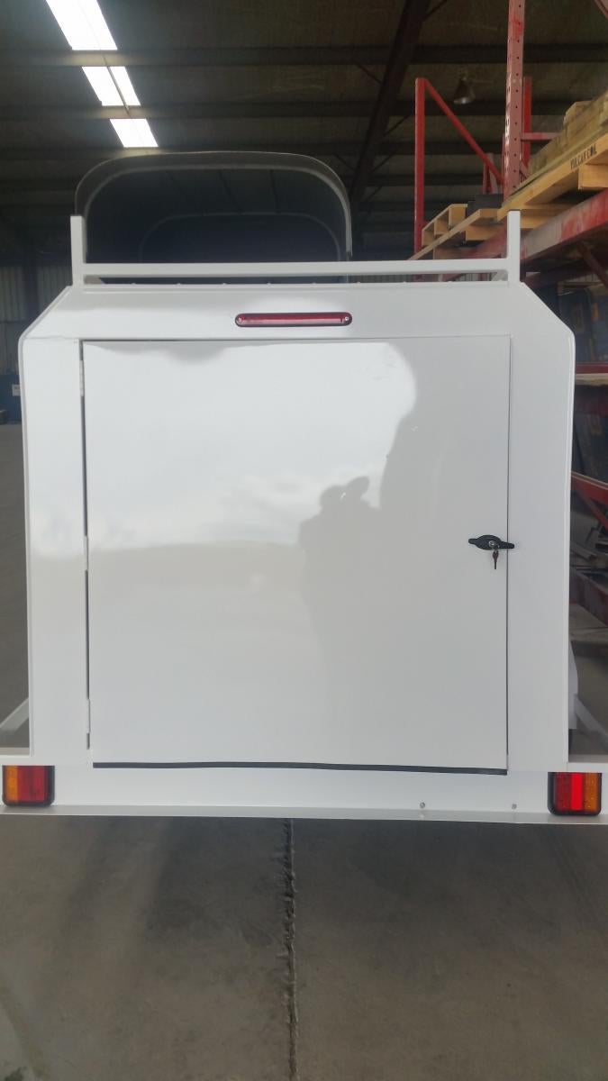 Pre Galv Mild Steel Chassis, Electro Galv Paneling, exterior painted, 17mm Treated structural plywood floor, two access doors, (Lockable) one at the back and one on the left side, Un Braked, 1 7/8 coupling, 1 x safety chain, LED Lights with High Stop light, 1 x pin flat plug, Tie rack on the roof, 14" tyres and wheels, 1 x spare wheel bracketed to the underbody of the trailer, Vin Tag. Call us today to view