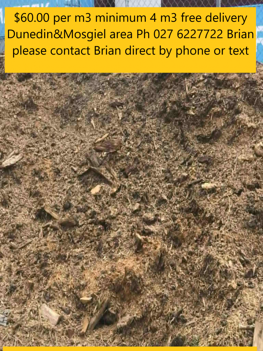 Selling: Organic Mulch $60.00 per m3 minimum 4 m3 free delivery Dunedin&Mosgiel area Ph 027 6227722 Brian please contact Brian direct by phone or text