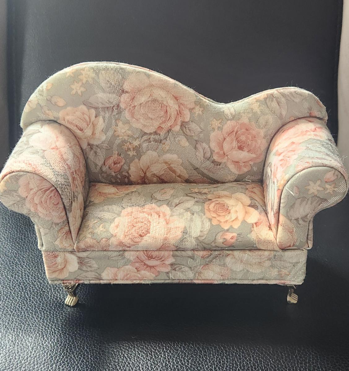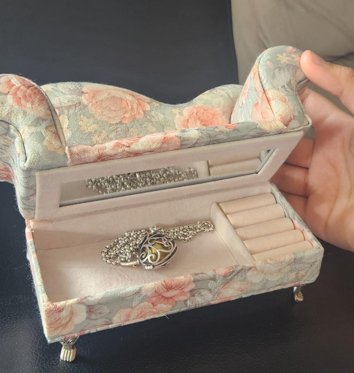 Pink Rose Print Small Sofa Jewelry Organizer, Elegant Hinged Trinket Box with Mirror