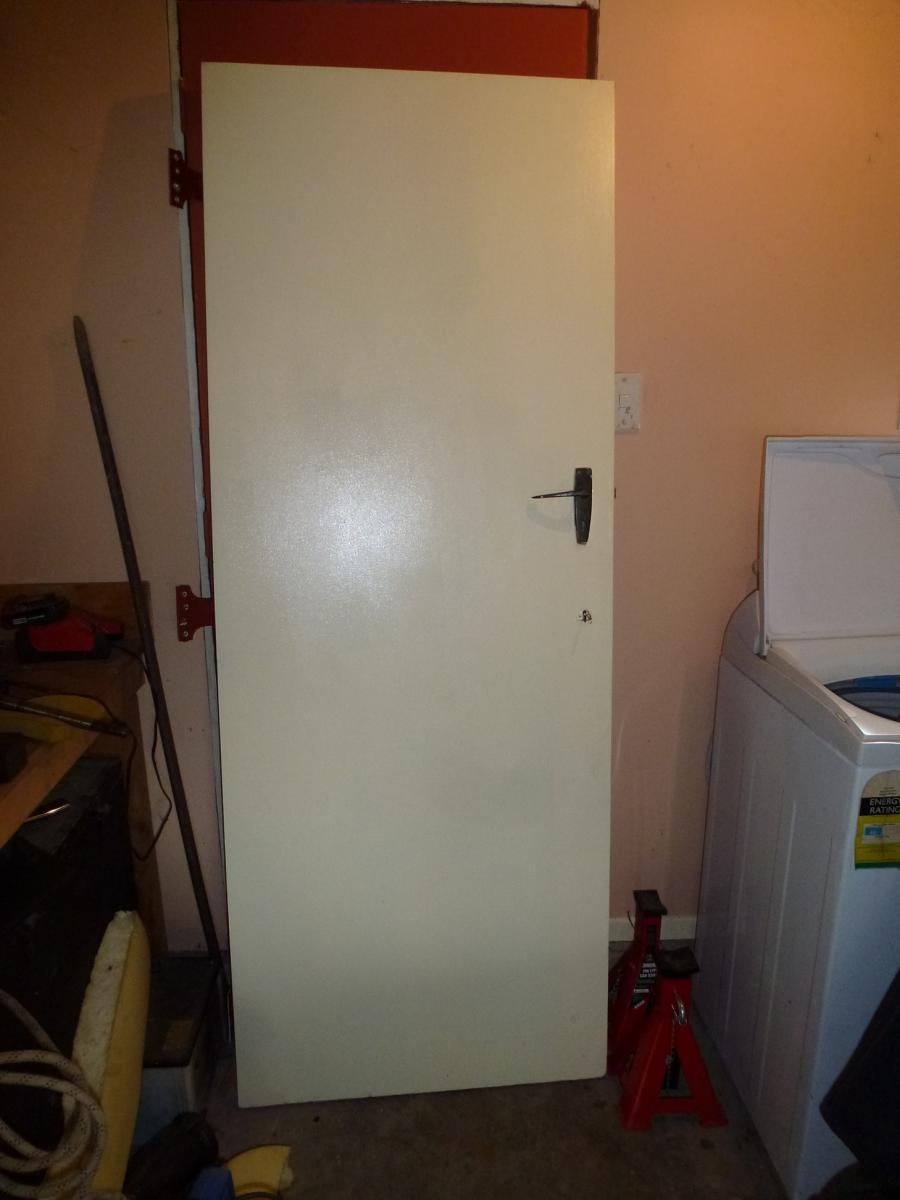 Door is 1970 high x 755 wide come's with lock, handles hinges and strike plates, ideal for outhouse, garden shed or workshop. Good Condition