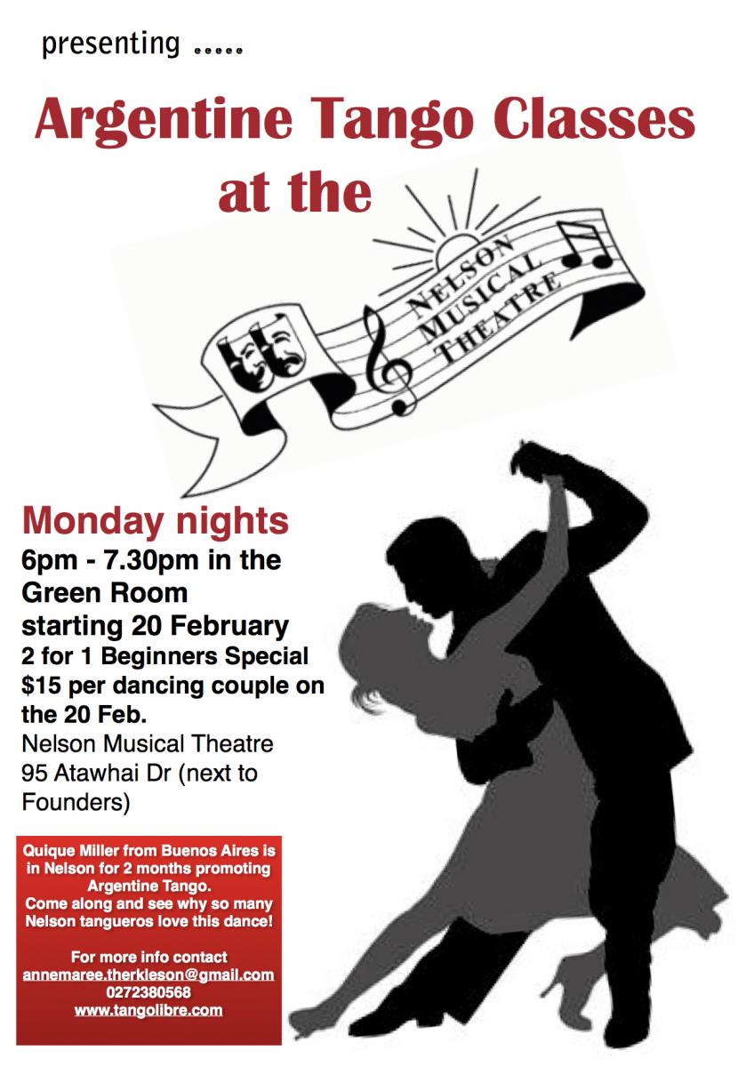 Beginners classes have started - there is still room for a few more guys or some brave girls who want to learn to lead! If you want to join us come along next Monday night 6pm at the Nelson Musical Theatre. Contact me if you have any questions: annemaree@tangolibre.com