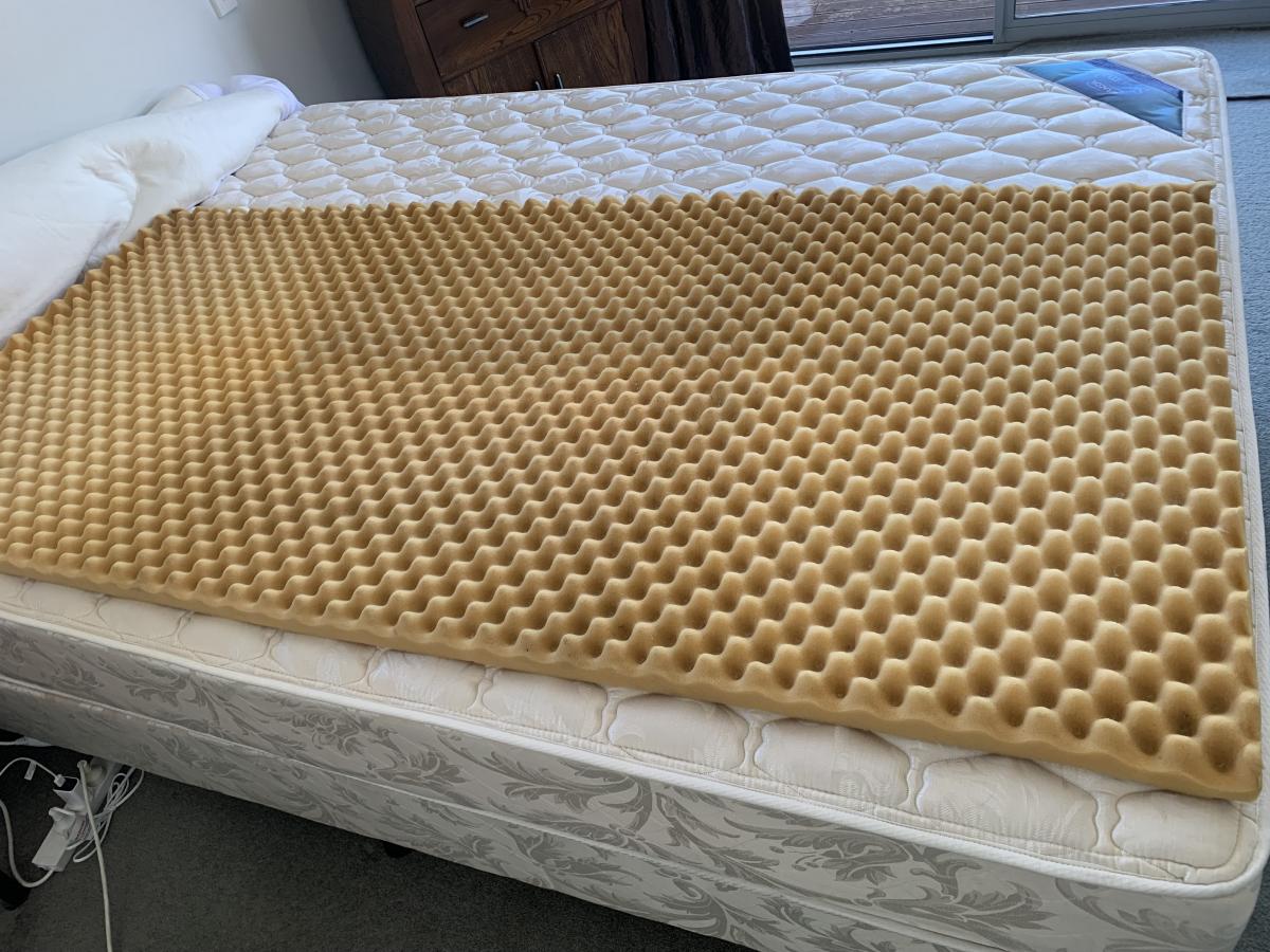 Used, no rips and very comfy as mainly been in storage but bit discoloured and has little bits of fluff in the holes.