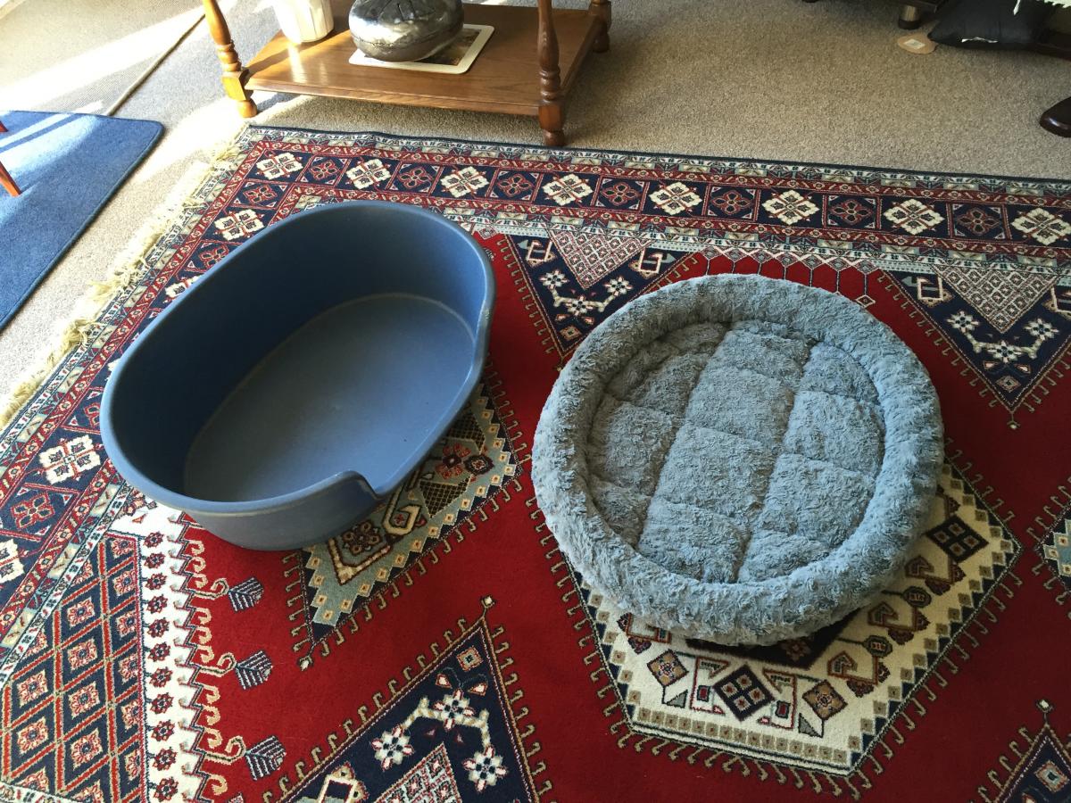 I have a plastic dog bed for sale with cushion to go with it. Sorry, not good with photos. Size is 65 cm x 45 cm