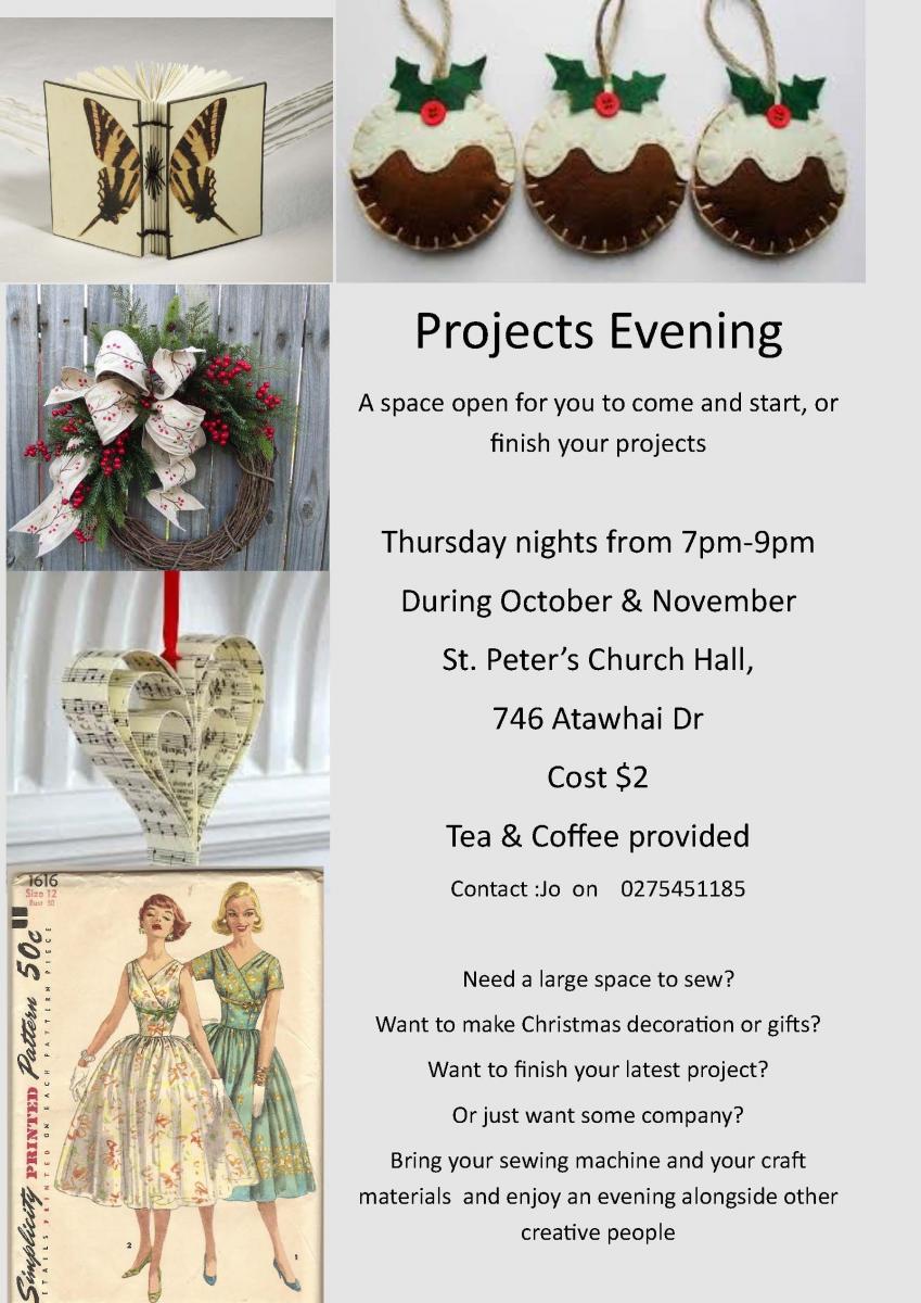 Need a large space to sew? Want to make Christmas decorations or gifts? Want to finish your latest project or start a new one? Or just looking for some company. Bring your sewing machine, and your craft materials and enjoy an evening alongside other creative people. Cost $2 Tea & Coffee … View moreNeed a large space to sew? Want to make Christmas decorations or gifts? Want to finish your latest project or start a new one? Or just looking for some company. Bring your sewing machine, and your craft materials and enjoy an evening alongside other creative people. Cost $2 Tea & Coffee Provided. St. Peters Church Hall 746 Atatwhai Dr.