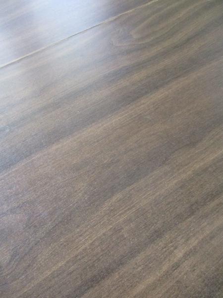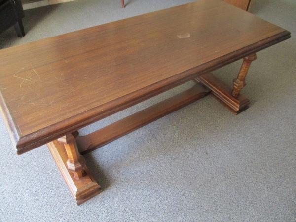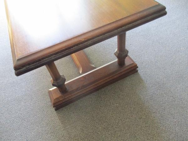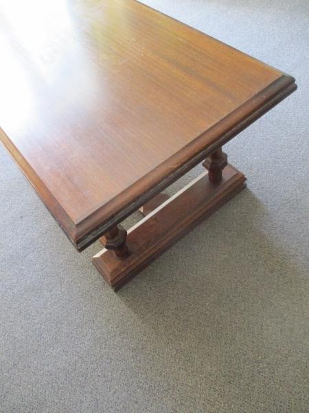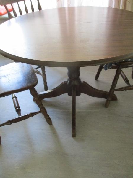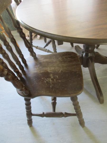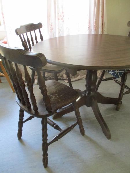 Dark wood on turned pedestal . seats several people. Dark formica top blends with wood. 110cm across. Height 75cm. 4 chairs