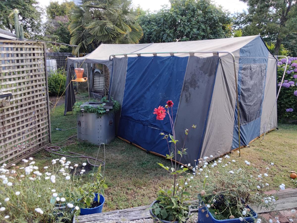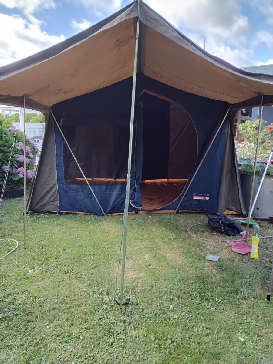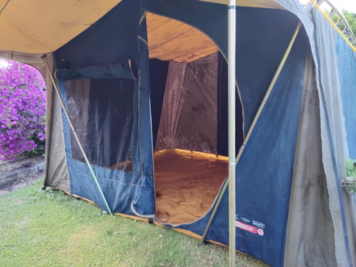 3600x2700mm plus 2500mm awning.a few stains from sitting in the garage but otherwise strong and hardy any actual wear.Also timber mussel floats and a folding table plus bits and pieces.