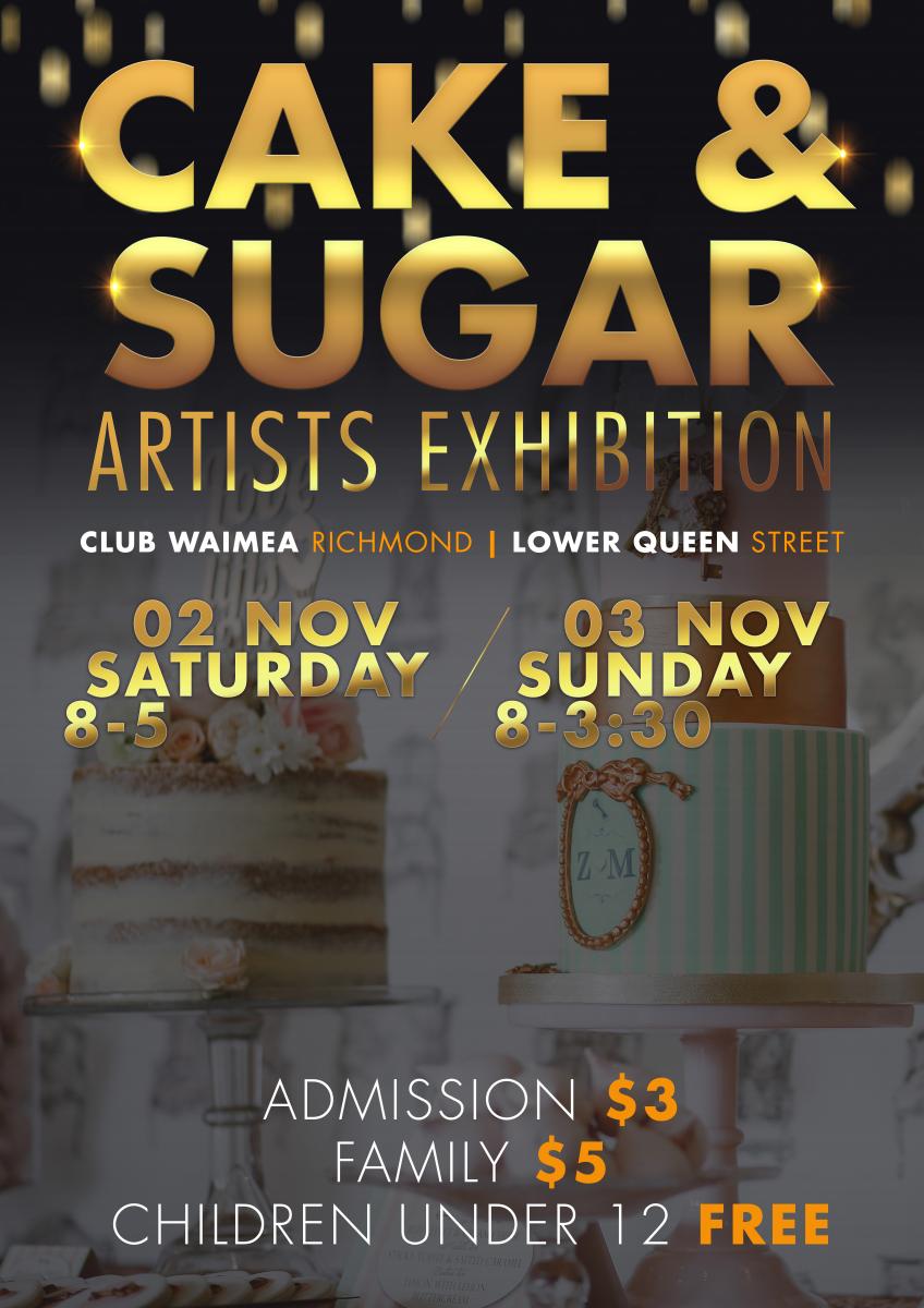Cake and sugar Artists Exhibition 2 and 3 November held at Club Waimea Richmond Lower Queen Street. There will be traders stalls where you can buy all your cake decorating needs. There will be plenty of cakes and sugar art on display. Come along to this Exhibition and see all the latest trendy … View moreCake and sugar Artists Exhibition 2 and 3 November held at Club Waimea Richmond Lower Queen Street. There will be traders stalls where you can buy all your cake decorating needs. There will be plenty of cakes and sugar art on display. Come along to this Exhibition and see all the latest trendy cakes and sugar art. Entry fee $3, $5 for a family and children under 12 free. Contact Desiree 0276302359