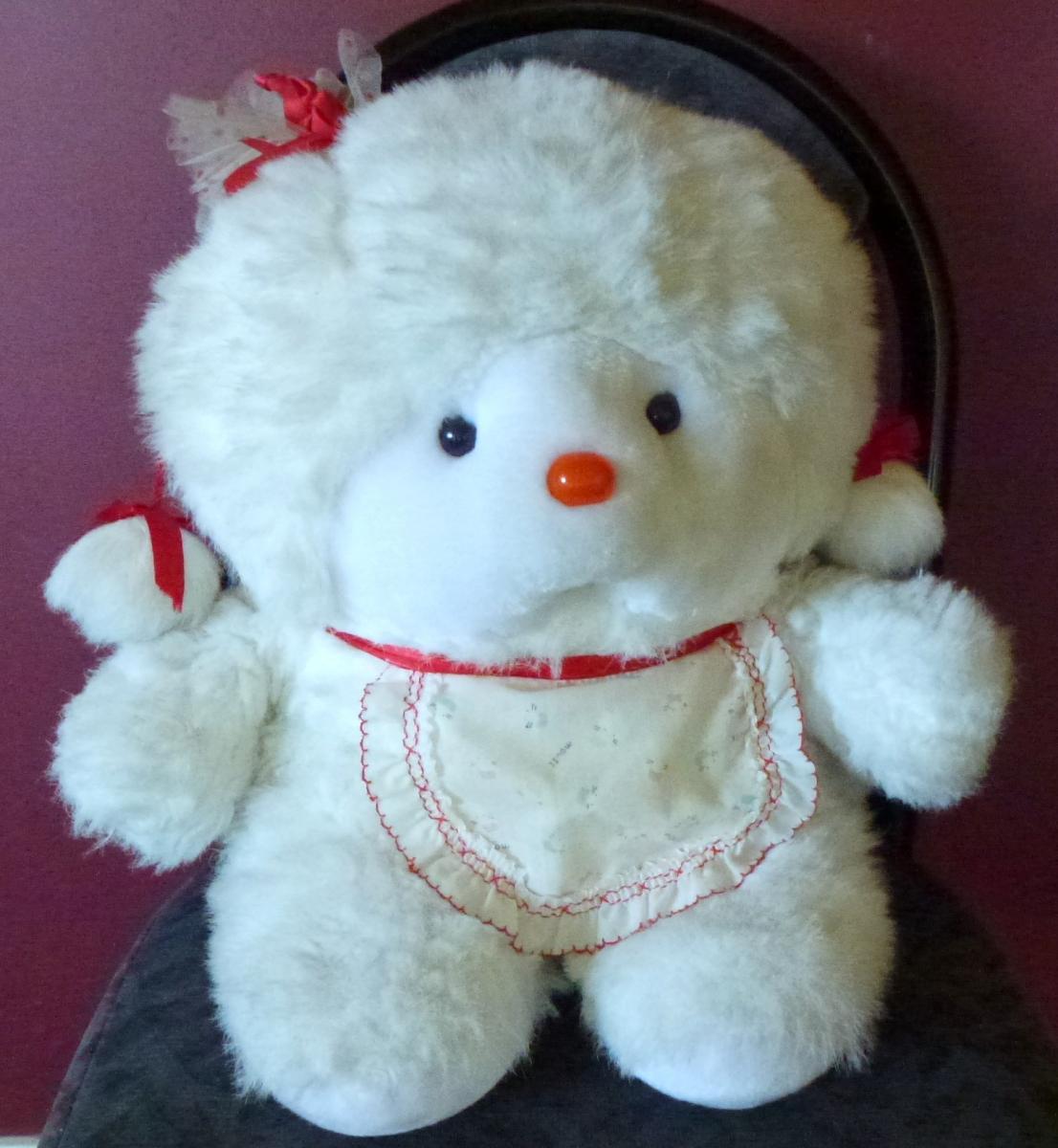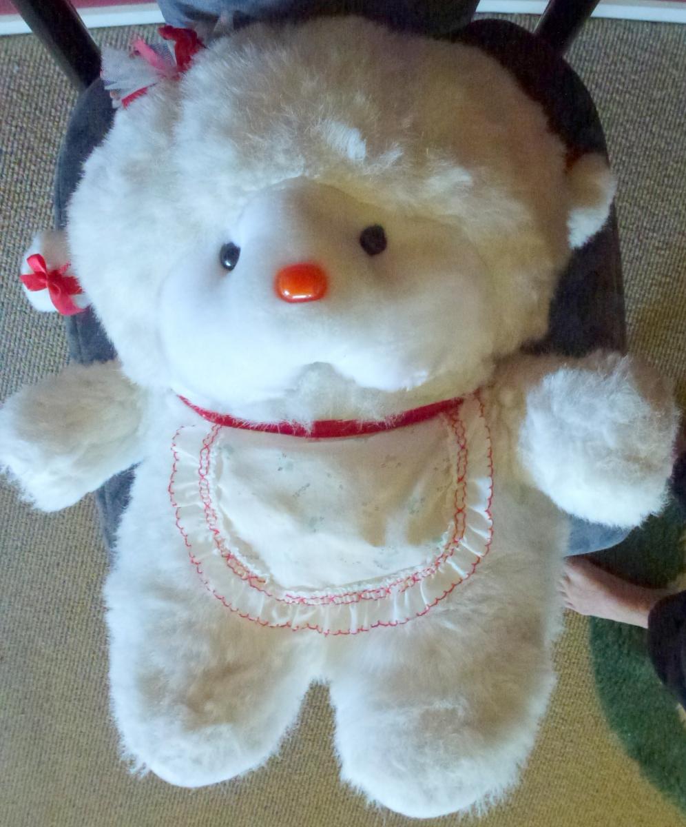 Cute furry toy, about 400mm long and wide, and 200mm high, has a pom-pom with bow hanging from each side of head, a little apron and bow decoration on head. You could remove these if you don't want them.