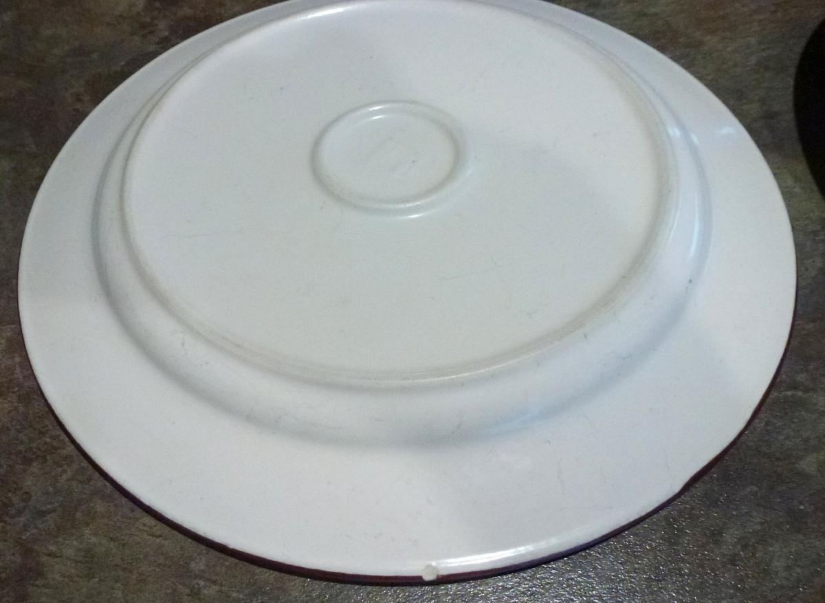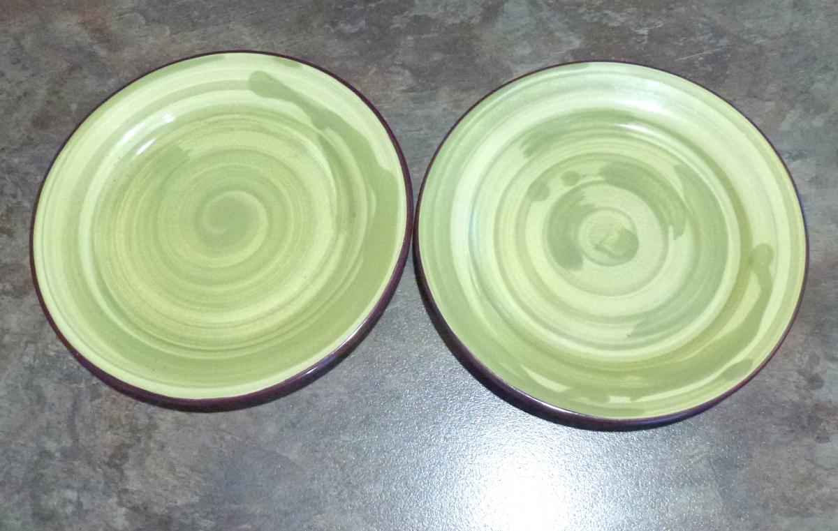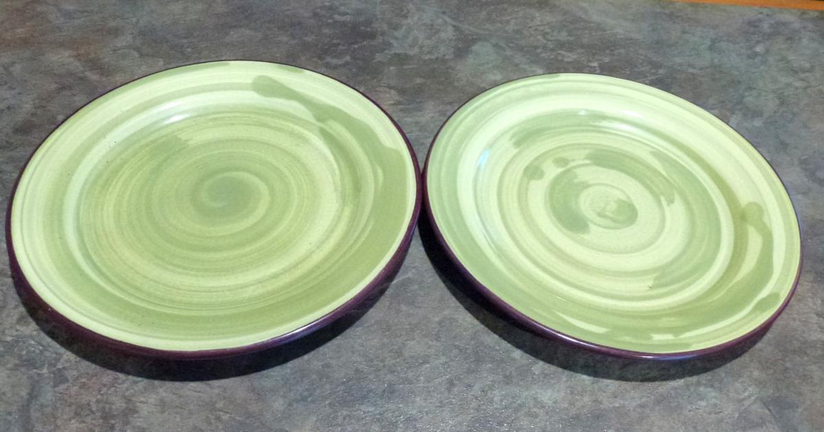 Two good sturdy dinner size plates with a runny paint effect and lovely eggplant coloured edges.