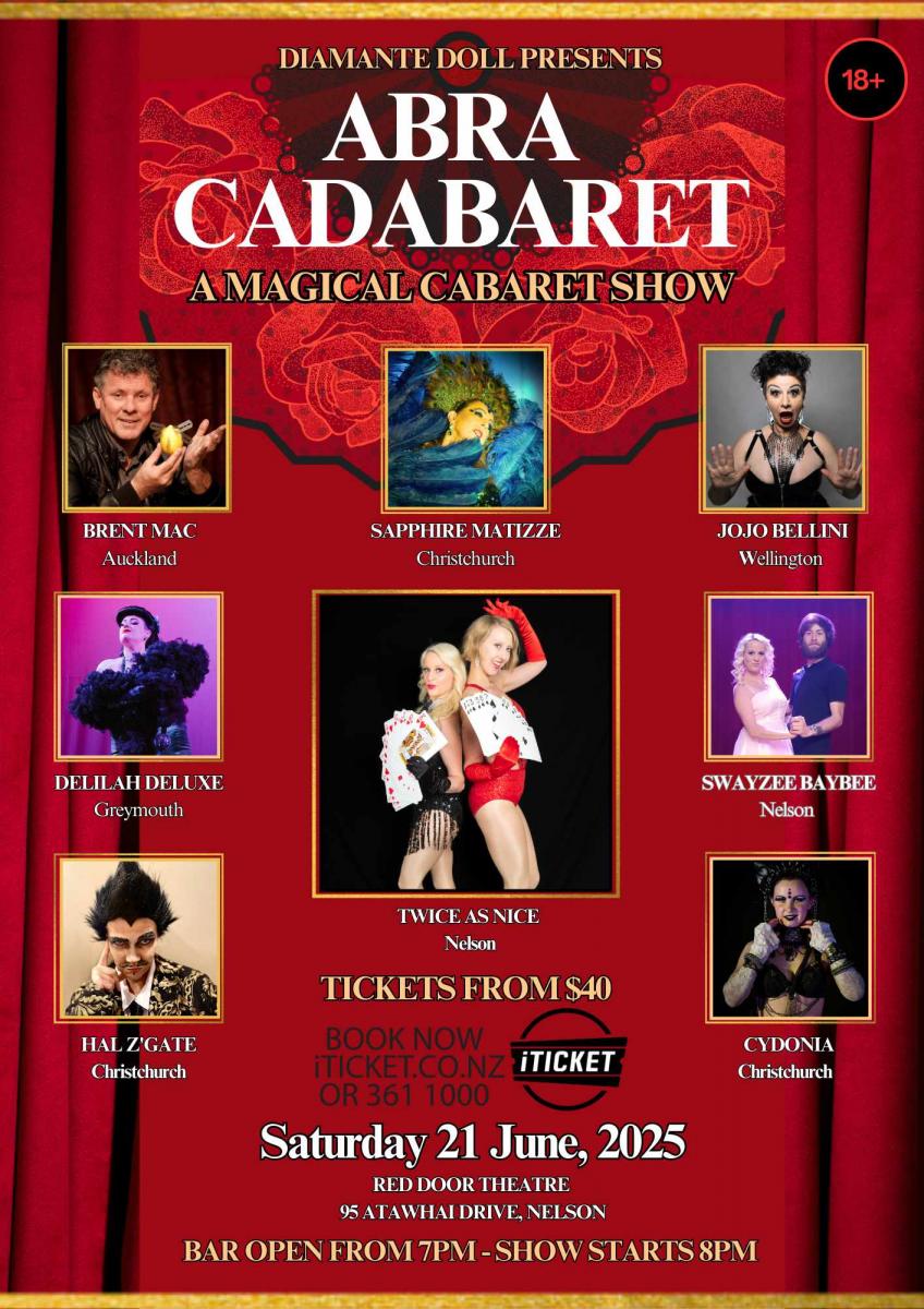 Featuring top award winning performers from around the… View moreHeads up for 21st June! From the producer of the sell out Illusionesque show, come witness amazing magic illusions from Nelson's own Diamante Doll and her assistant Lady Ros'e, New Zealand's only female magic duo Twice as Nice.