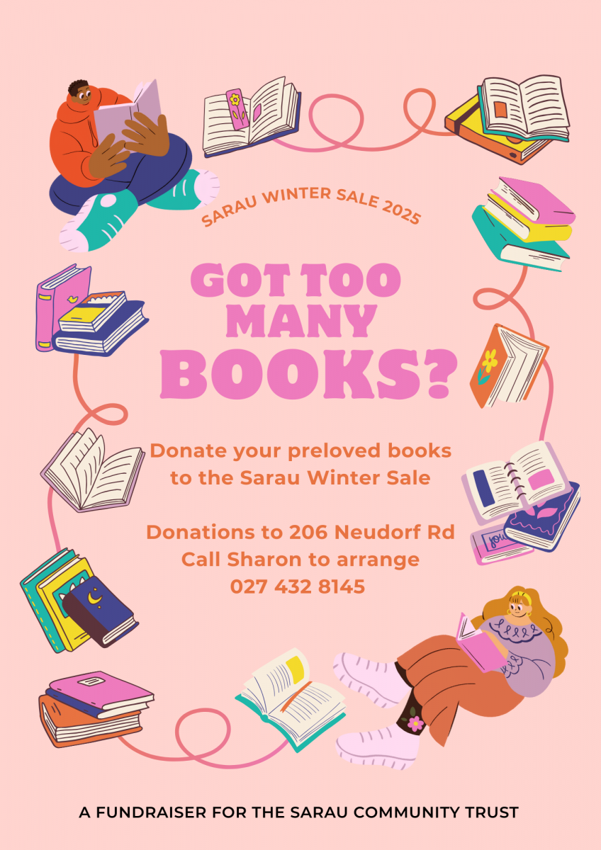 * BOOKS - drop off at 206 Neudorf Rd … View moreCalling for donations to the Sarau Winter Sale, a fundraiser for the Sarau Community Trust. Please give your donations to: