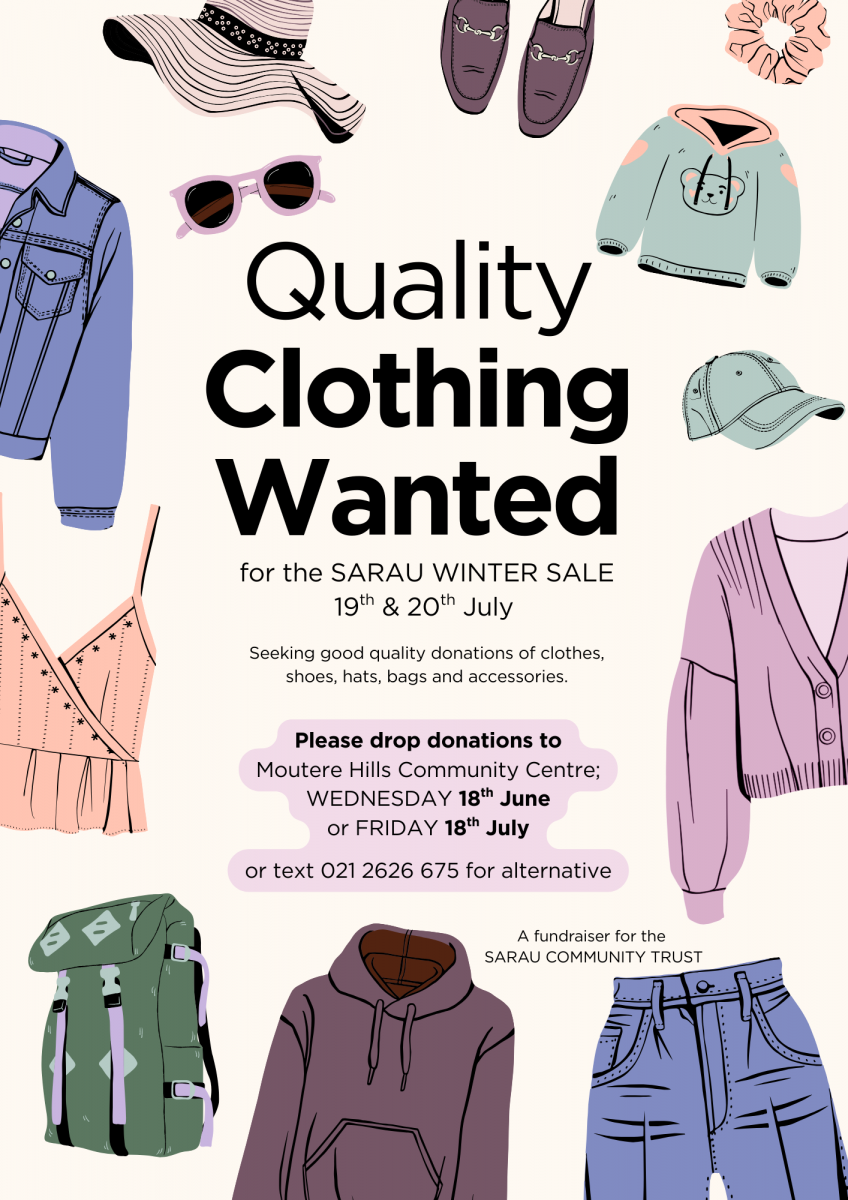 * Quality CLOTHING - drop off at the Moutere Hills Community Centre only on 18 June OR 18 July (or text 021.2626.675 for alternative)