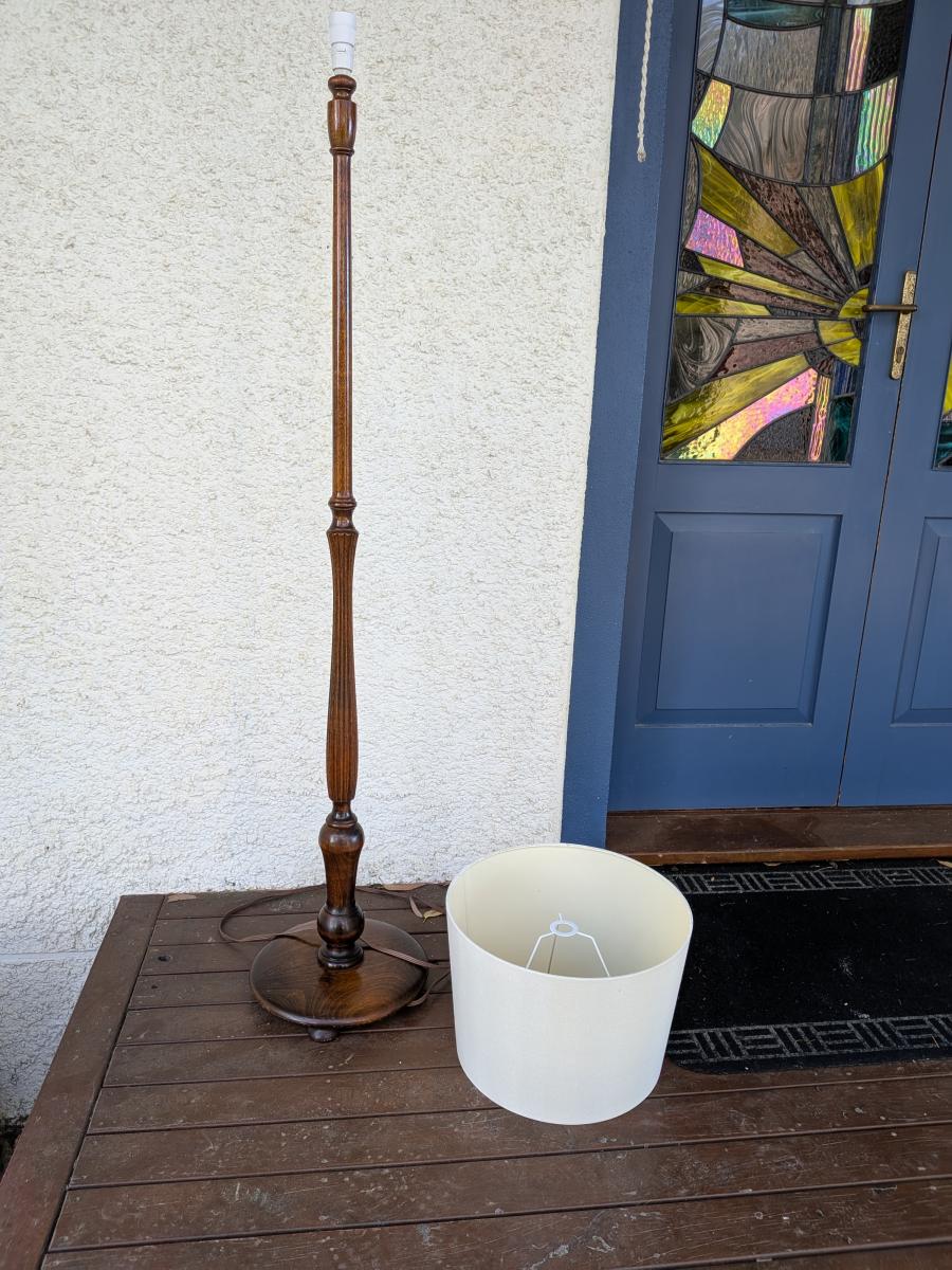 Wooden standard lamp in good condition with shade in good condition although a bit old.