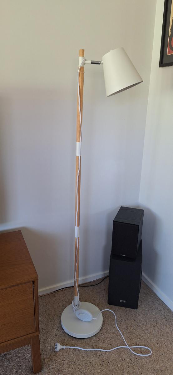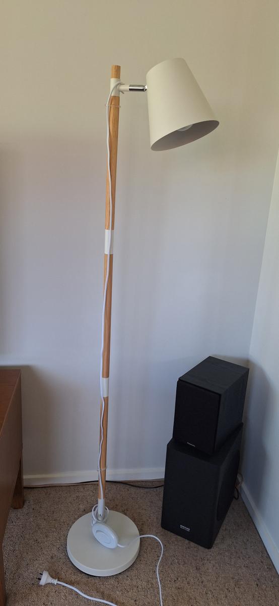 Purchased in June this year. Shade and bottom of lamp is cream coloured sterling and the post is wood. Lamp has been assembled but not used. Any questions pls text 027 831 4414