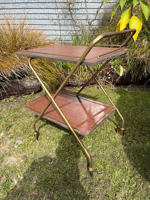 Very retro drinks trolley in wood grain & chrome. Wheels work perfectly, chrome a bit oxidised.